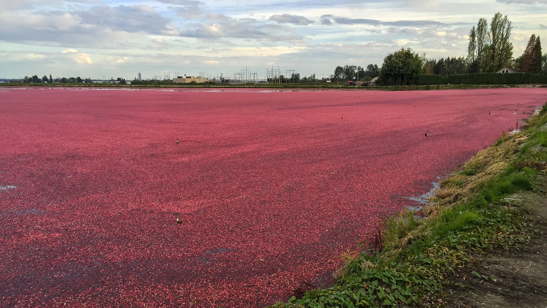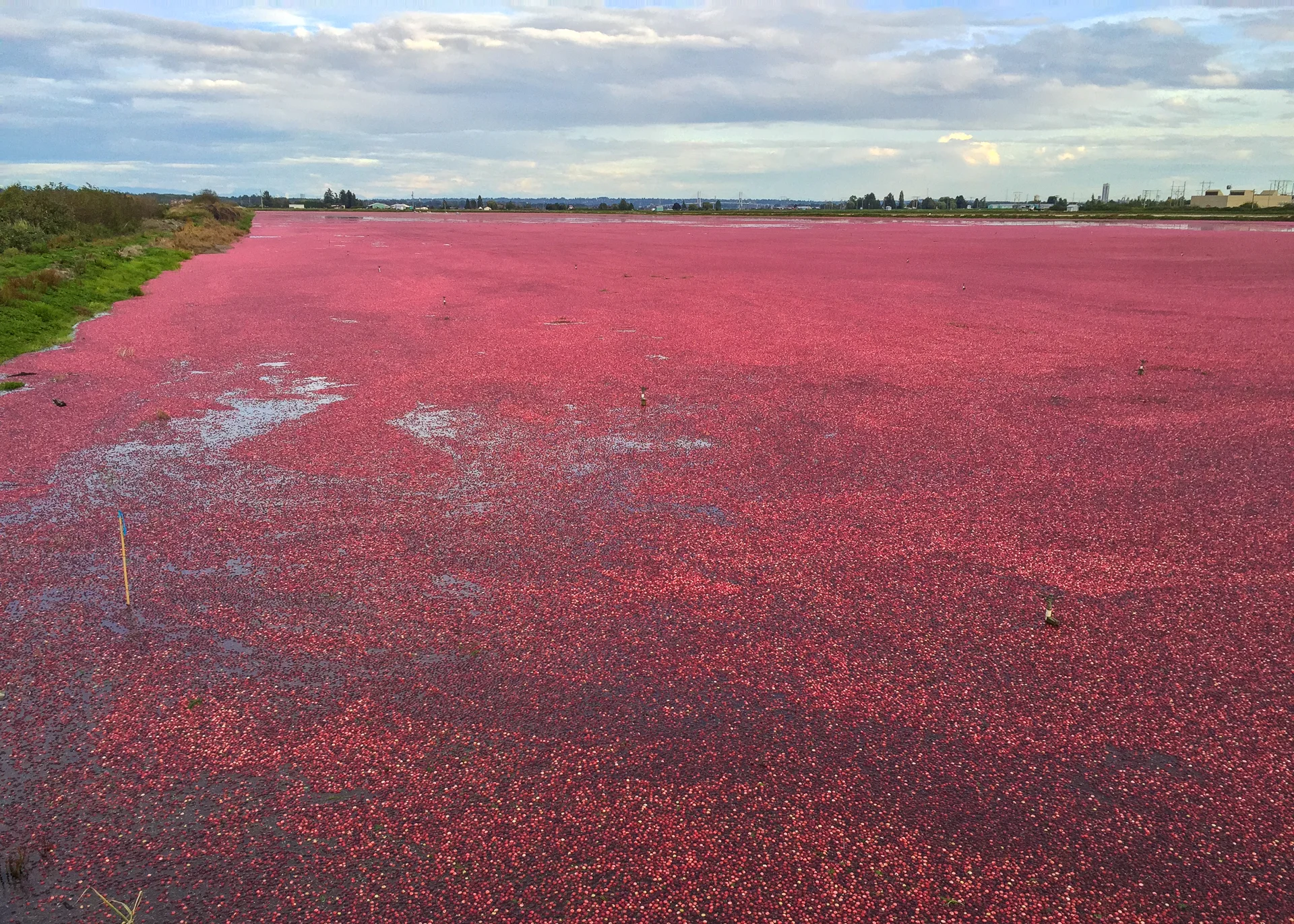 As you may or may not know, they grow a lot of cranberries around Vancouver. I was riding home from work the other week, and noticed that they were harvesting cranberries in one of the local fields. It's pretty interesting - they flood the field, the berries float and then they harvest them.