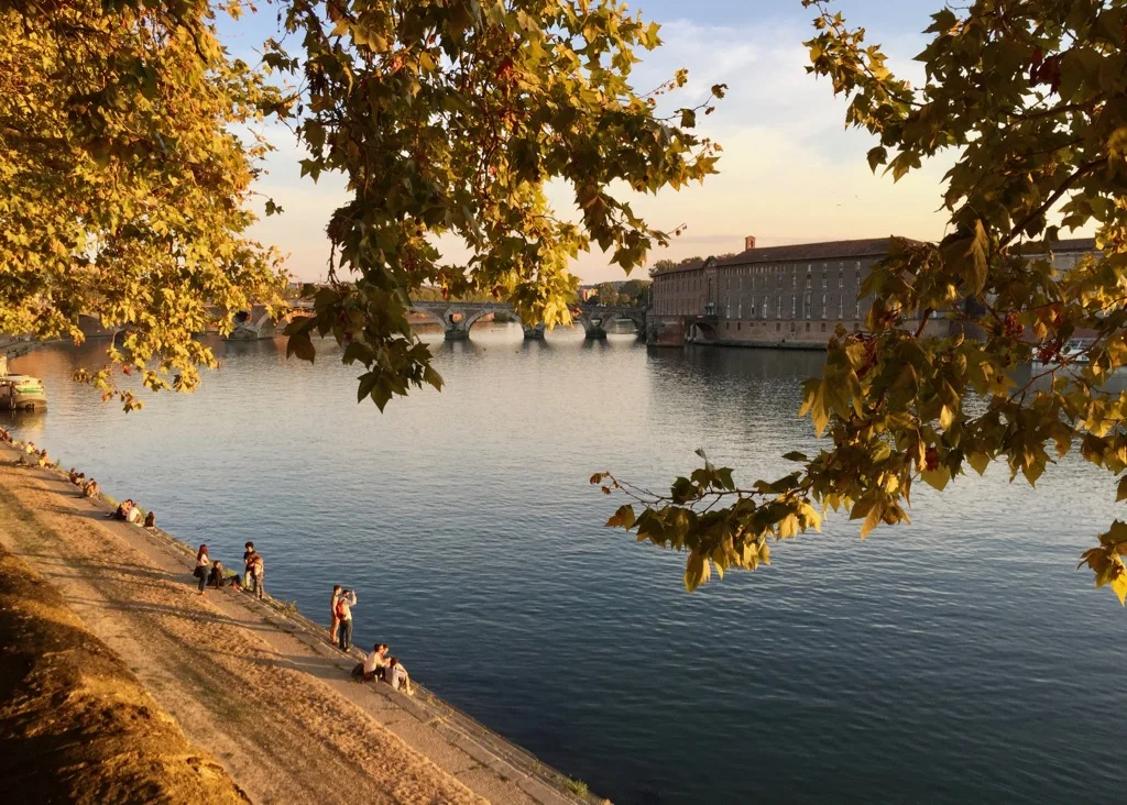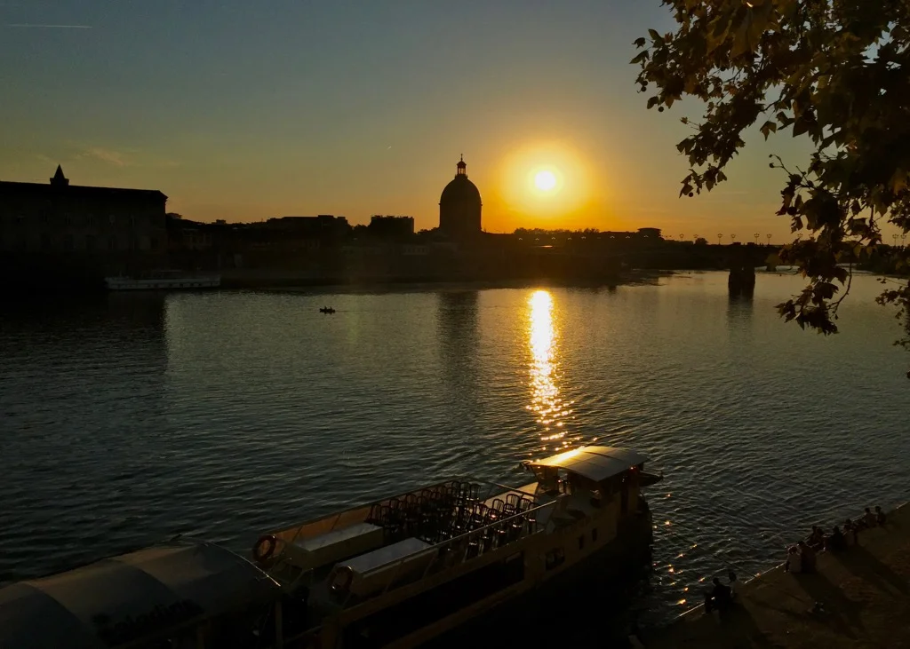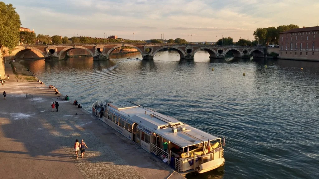 A river boat on the River Garonne, in front of the Pont Neuf in downtown Toulouse.