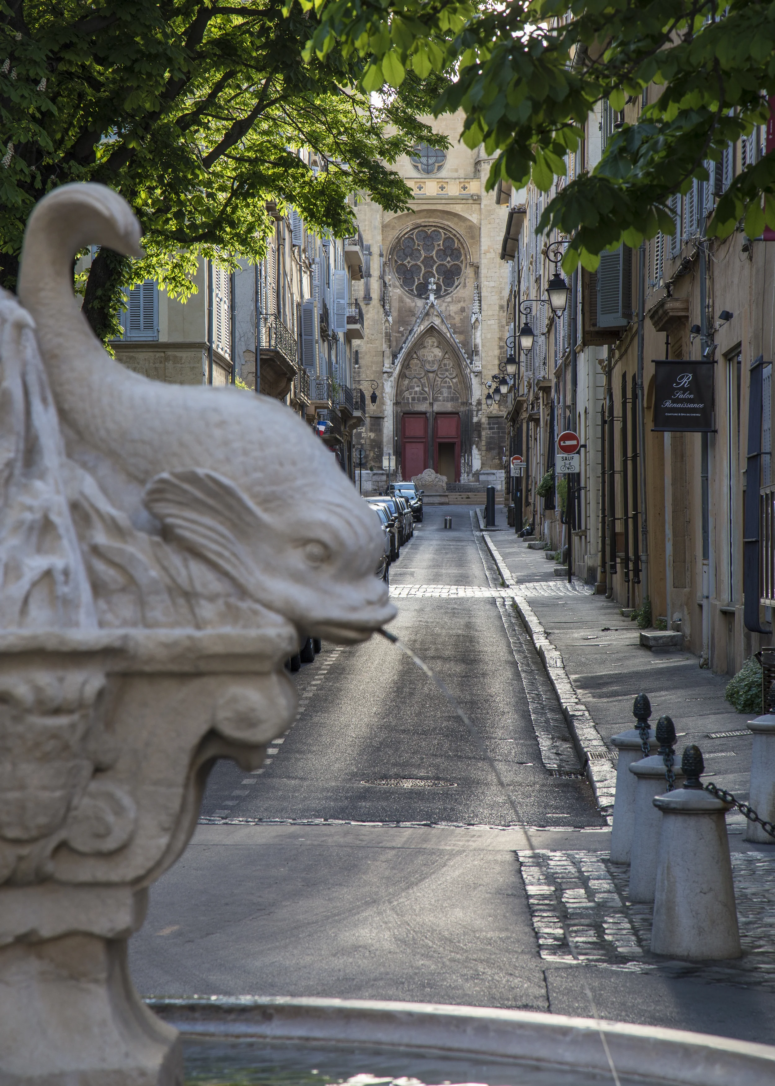 La Place des Quatre Dauphins, and it's fountain, looking up towards l'Eglise du Saint Esprit.
