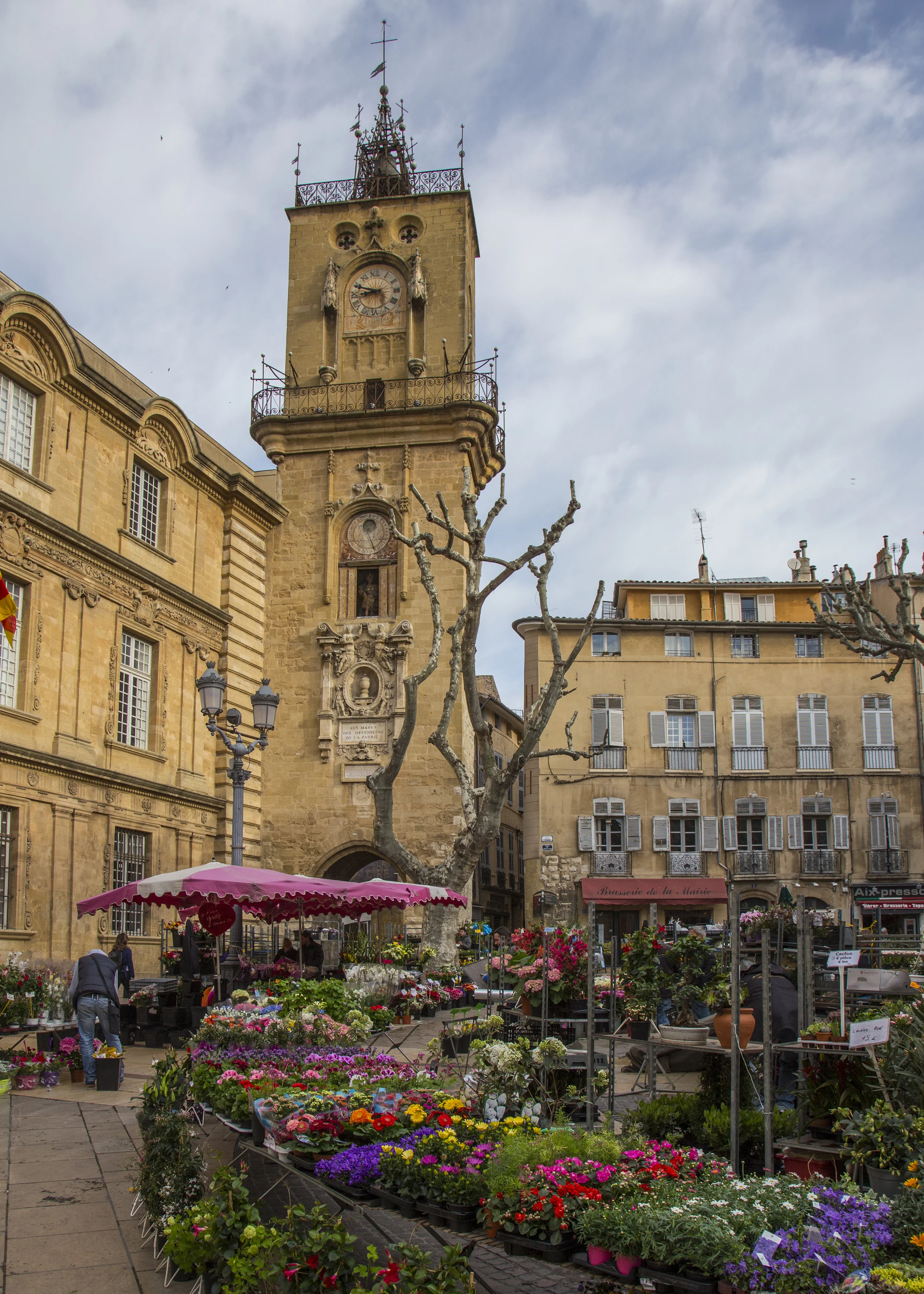 The Aix City Hall, and a flower market on a Saturday morning.