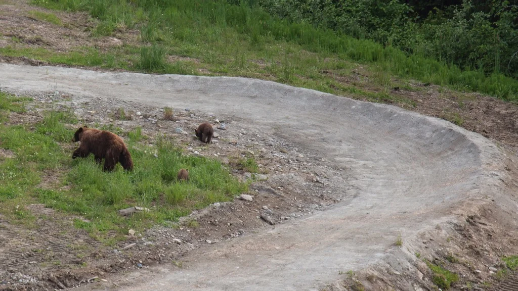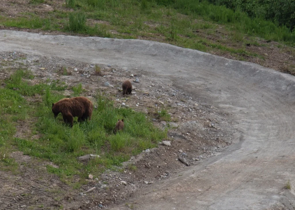 On the gondola ride back down, we got treated to lots of bears! We saw three solo (I assume males), browsing on different parts of the ski slopes. Then further down, right at the mid station of the gondola, there was a mother with two cubs. She was barely a hundred meters or so from quite a lot of people, and the Whistler team was doing what it could to keep people away.