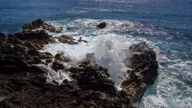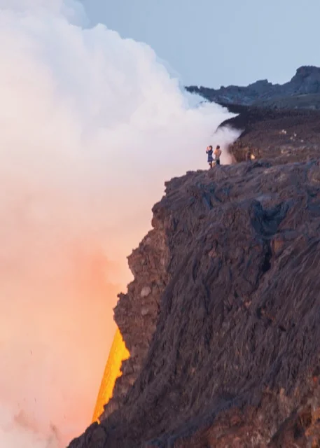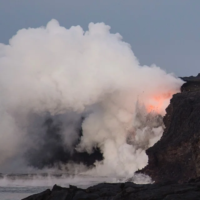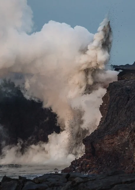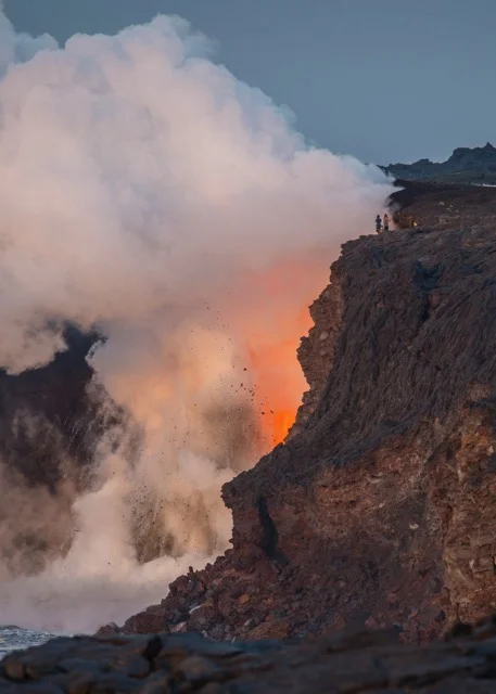 A close up view of the lava fountain pouring into the ocean. And yes, those dumbass people are standing at the top of it, with their small child - the whole cliff face is unstable and could (and has recently) go crashing into the ocean.
