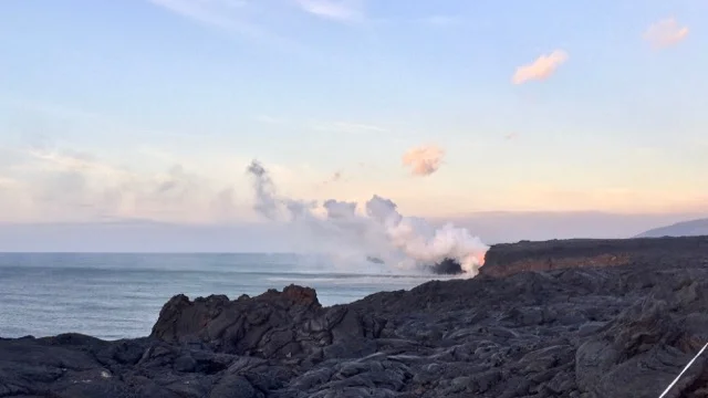 The tour we booked was with some locals, who would park you close (on their property), then bike out close to where the lava was flowing into the ocean. JC was our guide, and she lived right on the old lava flows, close to where we needed to be. After parking, we biked about 2 km out to the lava flow. It was a short walk from there to the viewing area, where you could see the steam from the lava entering the ocean. It was hard to see the actual "firehouse", but it was still pretty impressive. Sadly, there were people that ignored the safety barriers, and walked up right to the edge of the cliff where the lava was entering the ocean. Incredibly dangerous, as there were huge explosions from the lava entering the ocean.