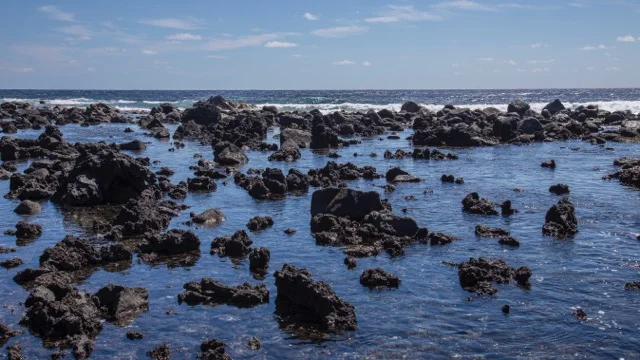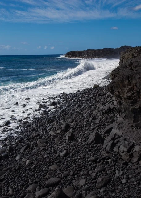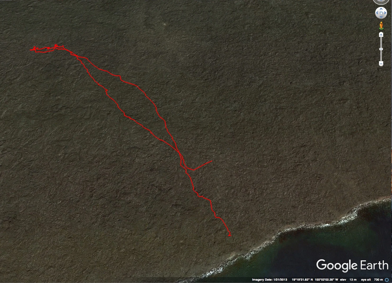 Looking back across the old lava flows, to where the fountain was entering the ocean.