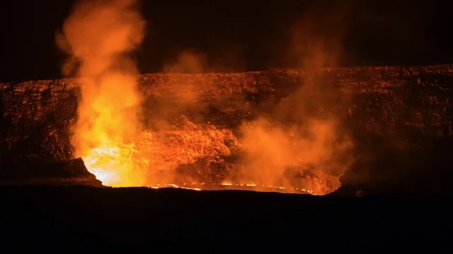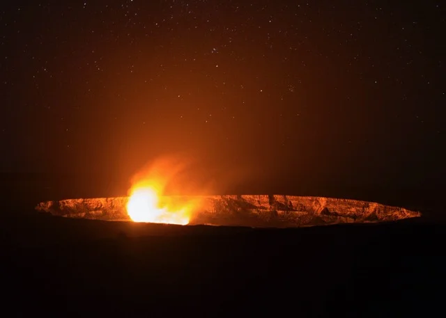 A view of the Kilauea crater from the Jaggar Museum viewing deck after the sun had set