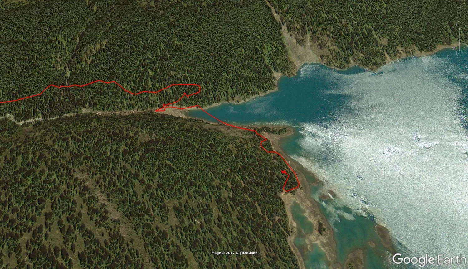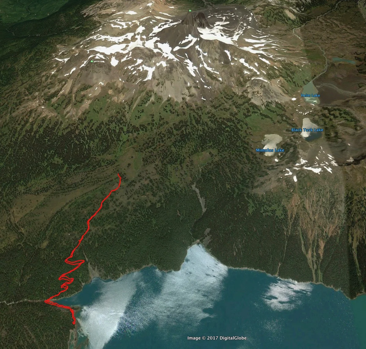 Google Earth view of our hike up to the lake.