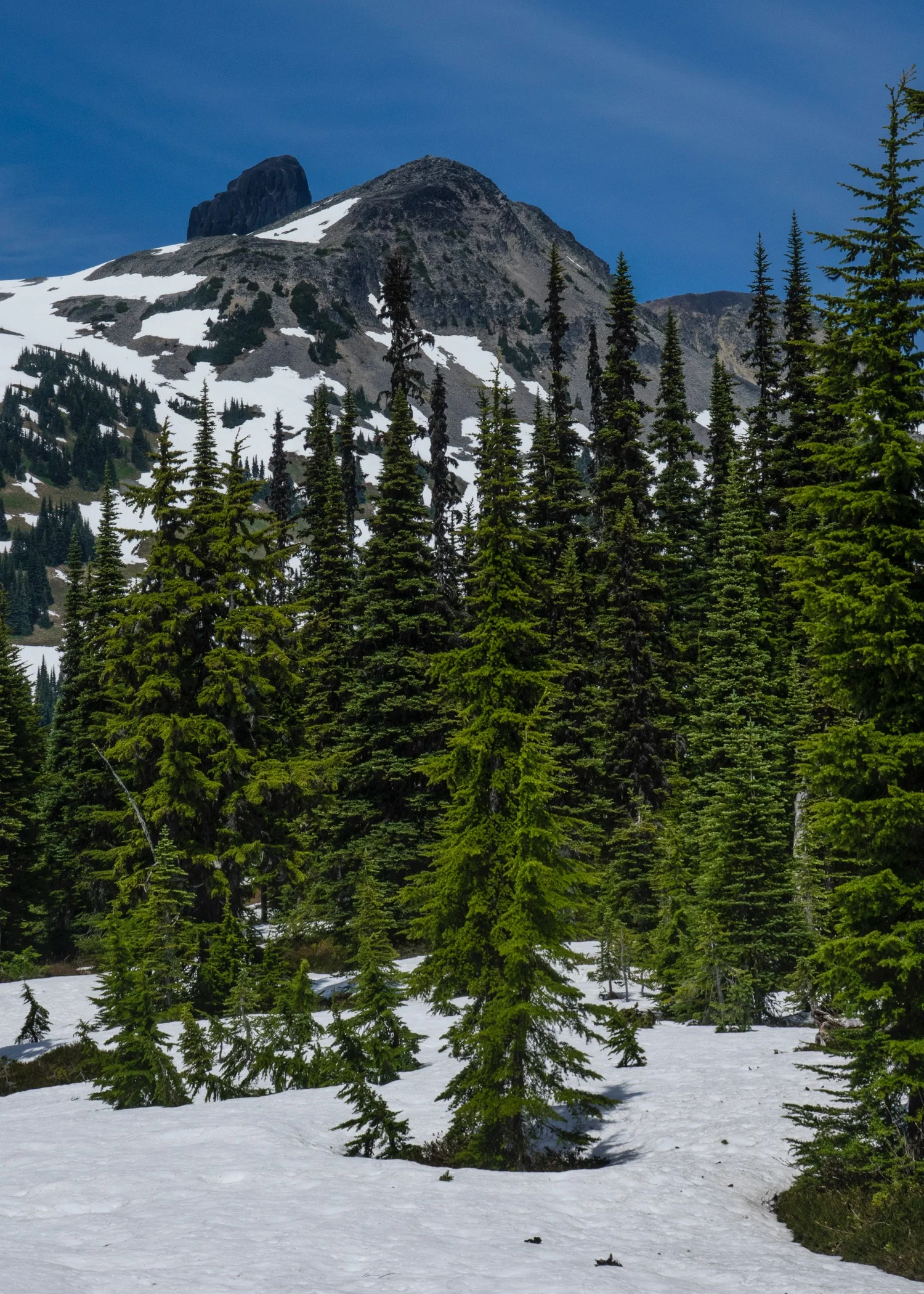 One of the benefits of camping at the lake is that it makes a day hike up to Black Tusk manageable. Our plan had been to do that before hiking back down on Sunday morning. But we were concerned about the amount of snow we were seeing, so we decided to hike up to the Black Tusk Viewpoint trailhead, to see how things looked.
