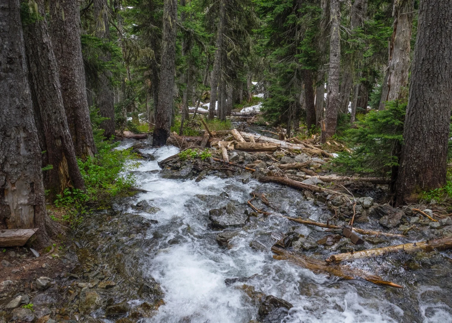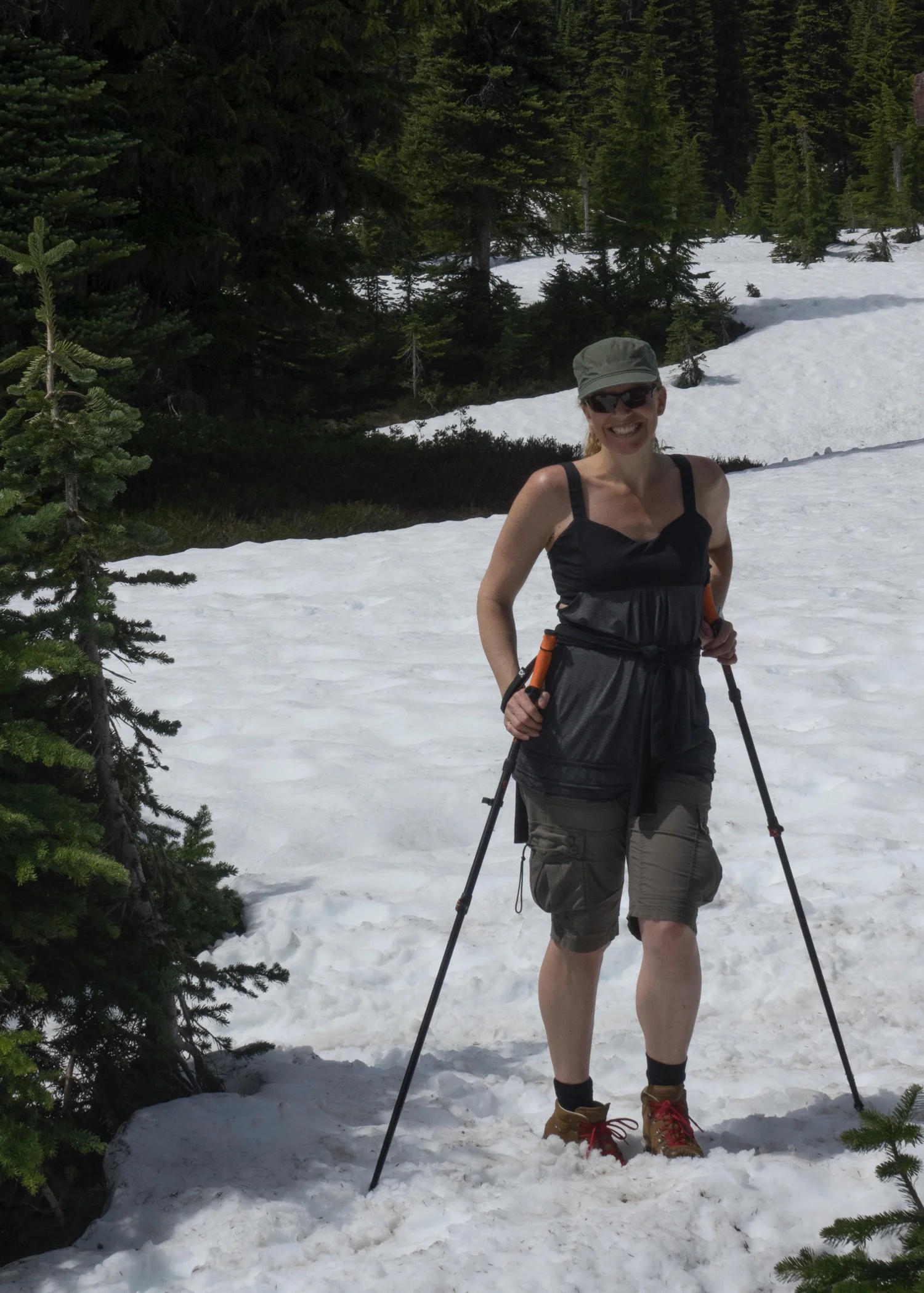 Having seen the state of the trail, we decided we'd wait until later in the summer when we do the longer hike. At least the snow will be gone at that point. So we turned around and hiked back across the snow field and back to the campsite.