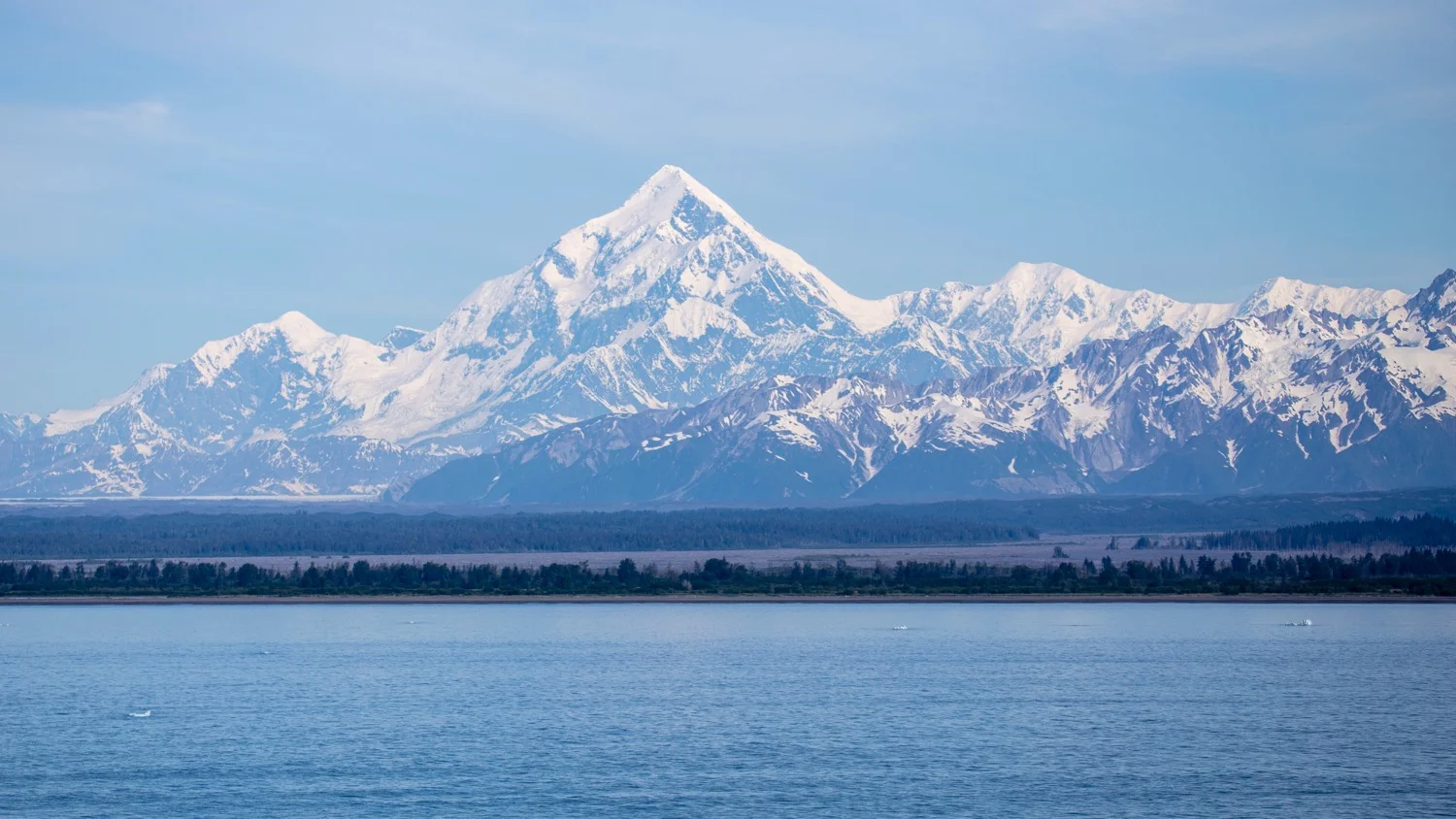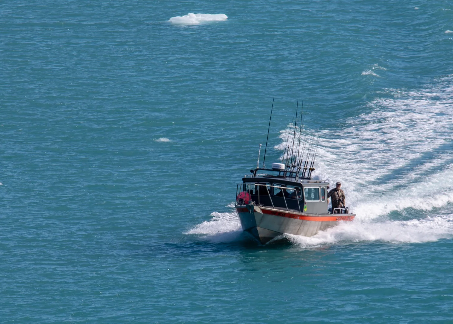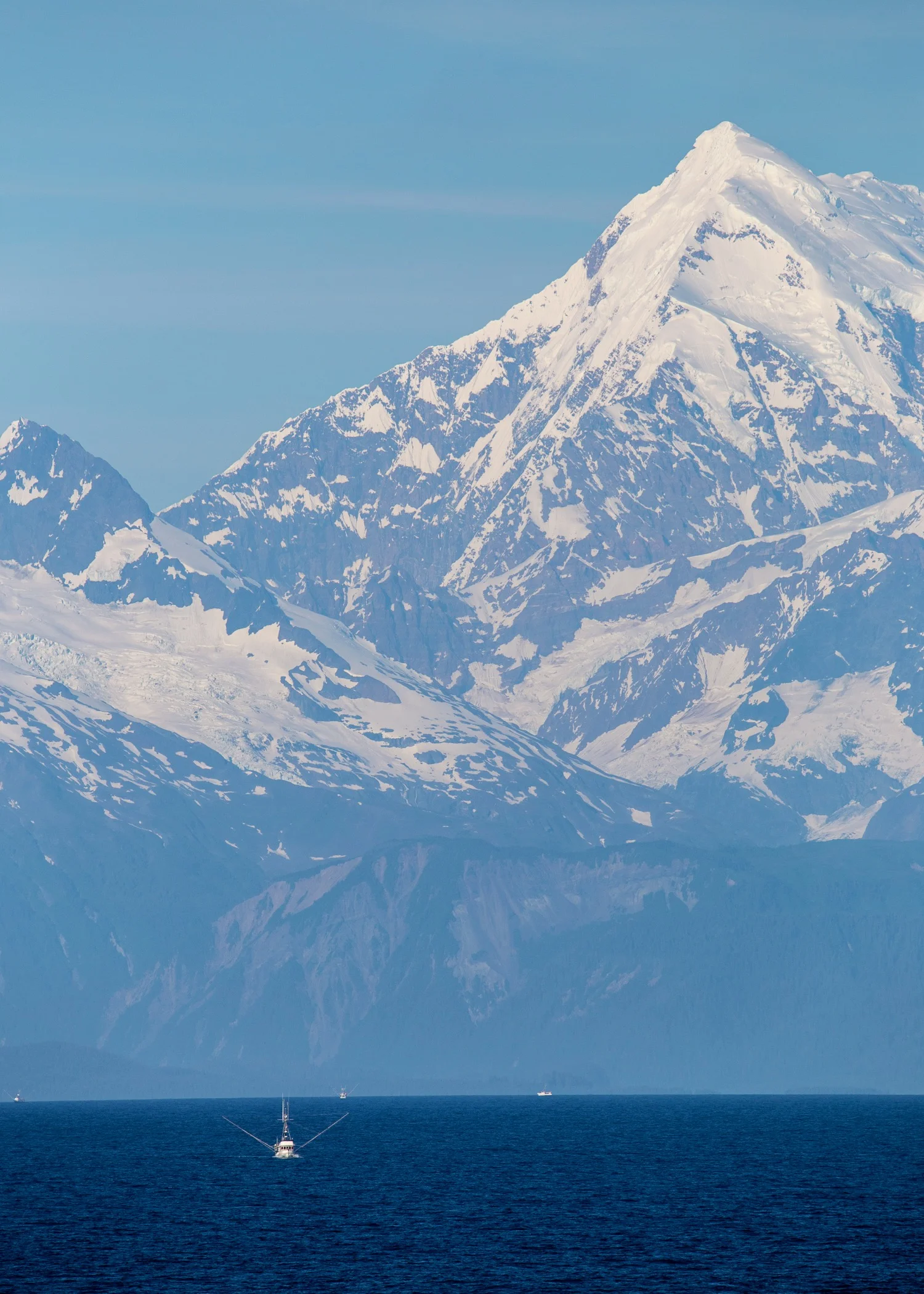 Mount Fairweather, domiating the small fishing boats out at sea.