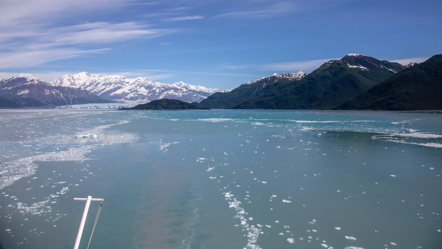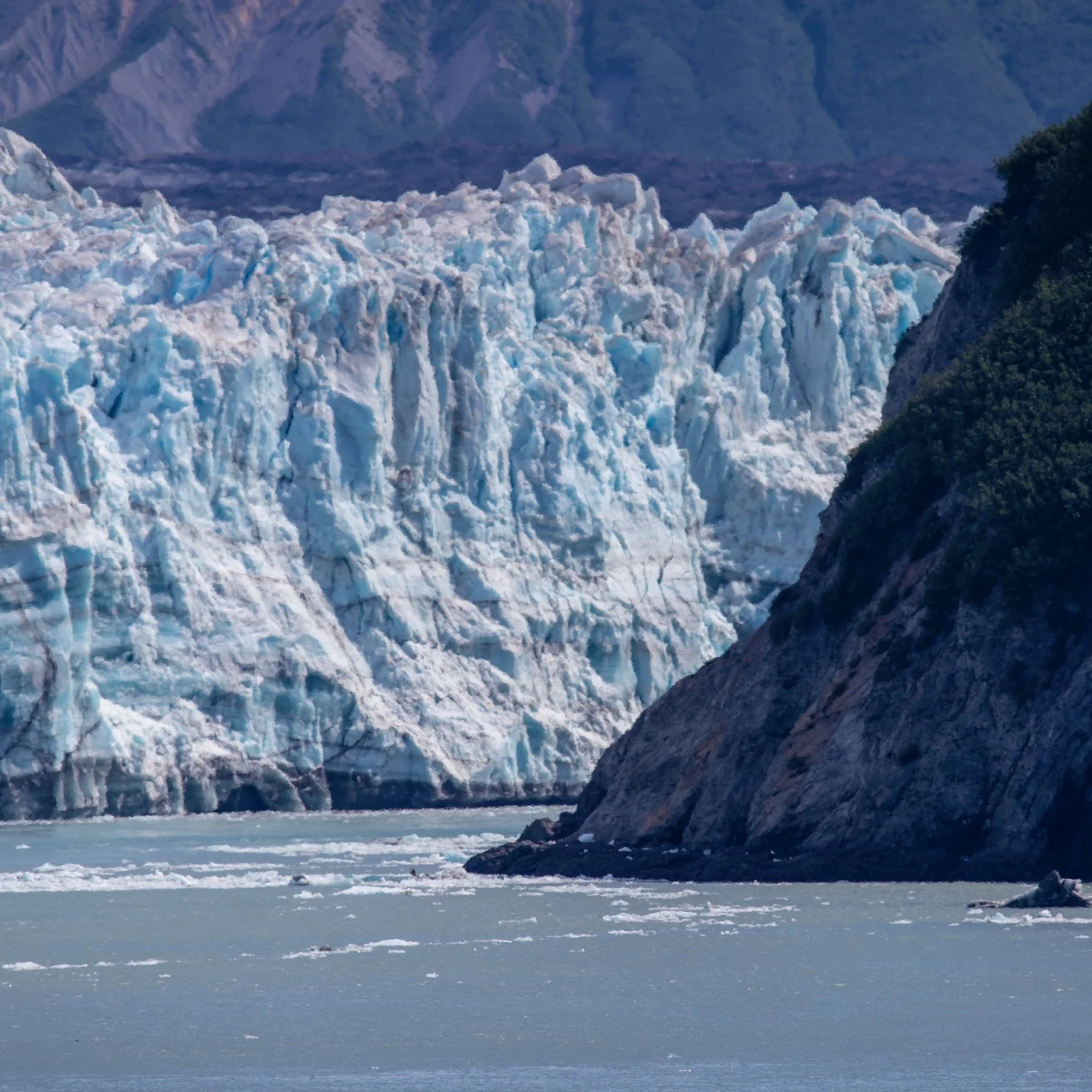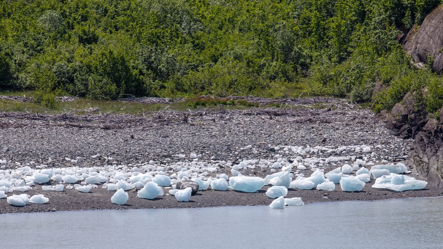 The Hubbard Glacier ice margin has continued to advance for about a century. It takes about 400 years for ice to traverse the length of the glacier, meaning that the ice at the foot of the glacier is about 400 years old. The glacier routinely calves off icebergs the size of a ten-story building.