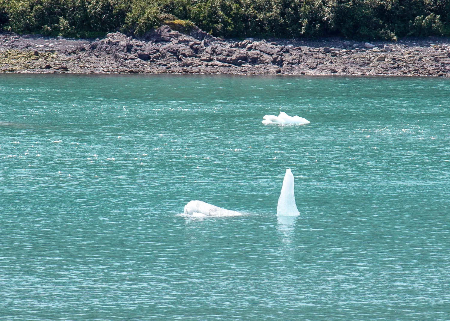 Where the glacier meets the bay, most of the ice is below the waterline, and newly calved icebergs can shoot up quite dramatically, so that ships must keep their distance from the edge of the glacier in Disenchantment Bay. We didn't see any dramatic cavings, and the naturalist mentioned that since it's so warm, they don't see as many big icebergs as they used to. We saw a few small calving events, and the sound of them, even if small, was amazing!