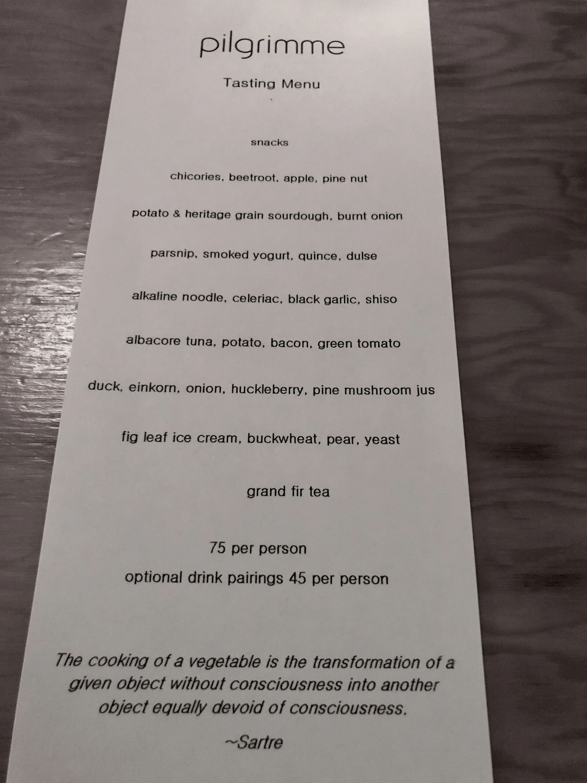 The only reservation we could get was super-early - 5:00! So we headed over, and not surprisingly we had the place to ourselves for the first little while. Dinner was a seven-course tasting menu, and as always, they came up with some interesting dishes for us to try.