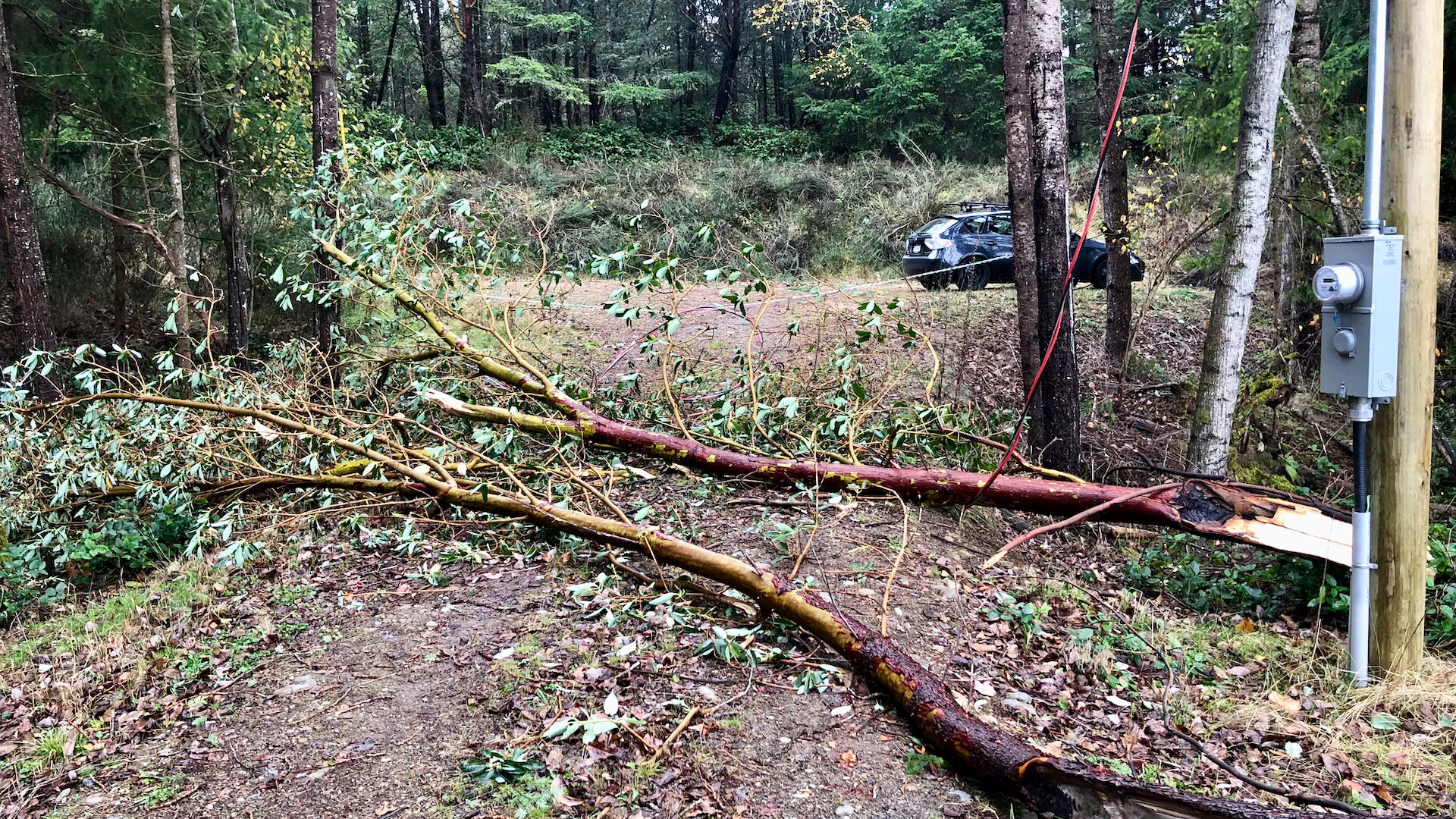 Earlier in the week, we had lost connectivity to our video camera and our thermostat in the utility shed. That was odd, but we did not think much of it. When we arrived on Wednesday morning, the source of the problem was immediately obvious - we had lost the tops out of a couple more arbutus trees, and they had come down and taken out the power lines.