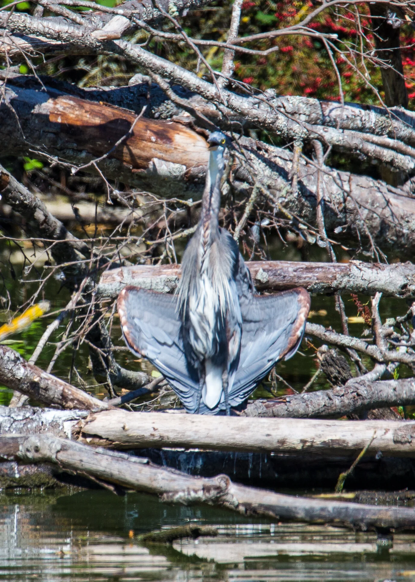 A blue heron drying its wings.