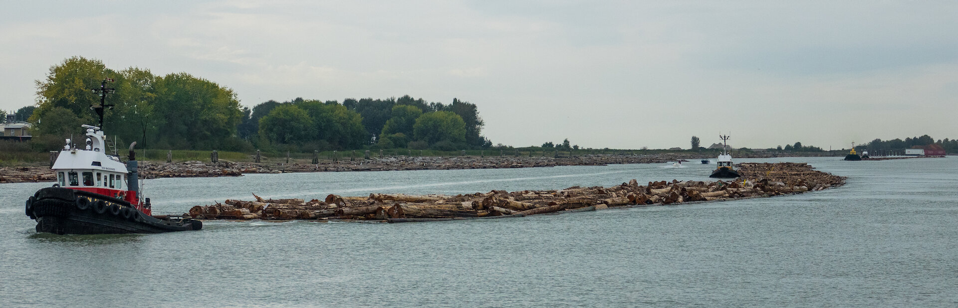 We parked a bit north of the river and followed a trail down between two of the golf courses to the trail along the river. It was quite clear that horses uses these trails frequently. Once at the river, we saw a couple of sets of tug boats pulling log booms. This is pretty common in this part of the world, but it’s not something you see you close very often.