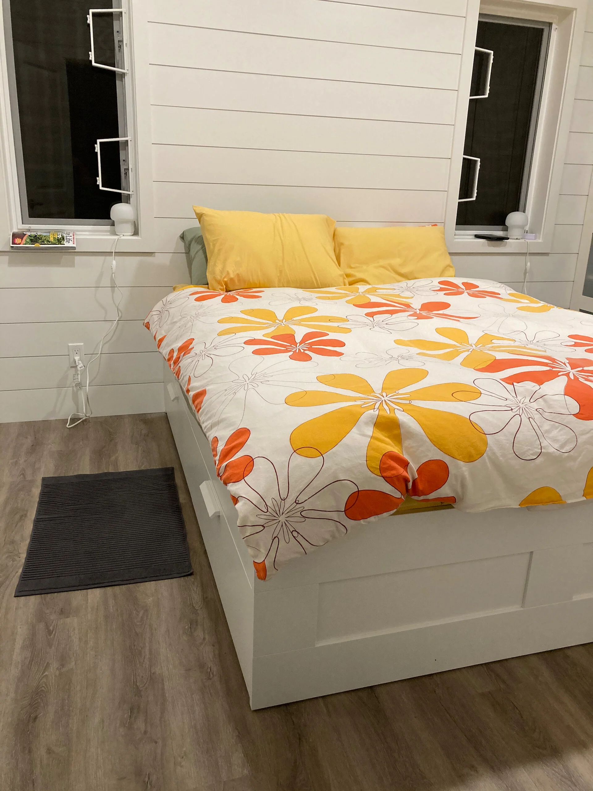 It was around 9:00 p.m. when we arrived at the cottage and got the truck unpacked. We spent some time organizing, then started to tackle putting together the bed frame. We got as far as the frame (the model we bought has drawers under it), but we didn’t feel the need to tackle that part. We had what we needed, and it was still after midnight by the time we got to bed.
