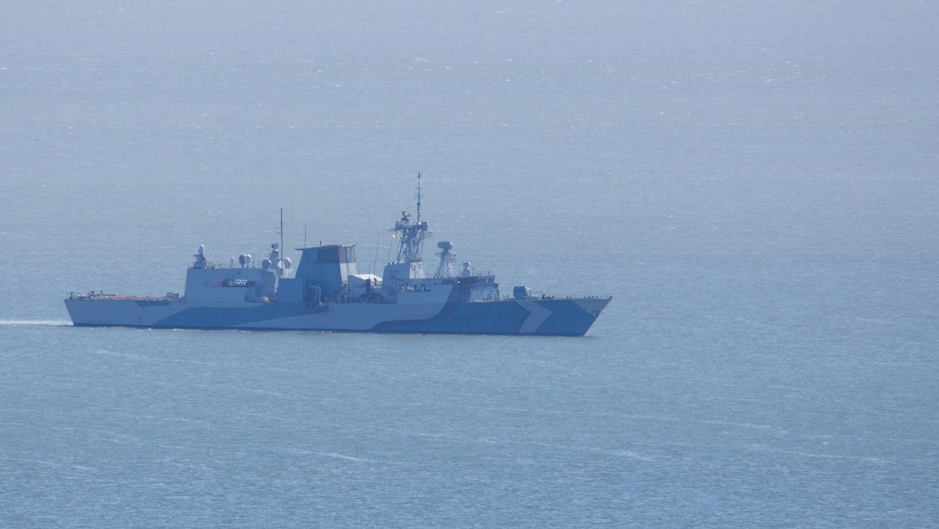 The HMCS Regina (FFH 334), a Halifax-class frigate that displaces 4,750 long tons (4,830 t) and are 134.65 metres (441 ft 9 in) long. The frigate has a maximum speed of 29 knots (54 km/h; 33 mph) and a range of 7,000 nautical miles (13,000 km. It was upgraded to the commemorative "dazzle" camouflage in August 2020.
