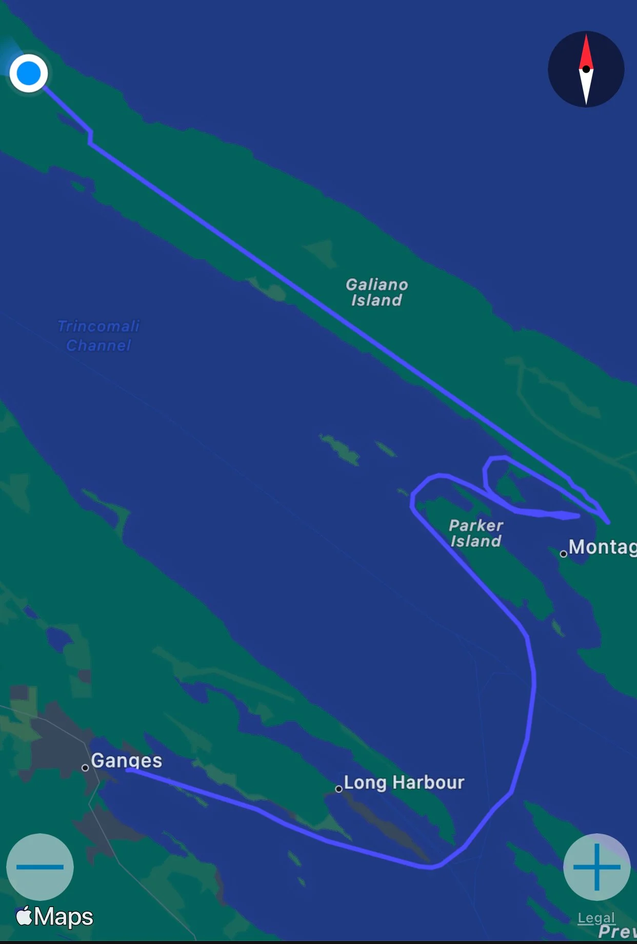 The trail of our trip to Salt Spring. I forgot to turn it off after we got back, so no, we did not drive the boat up the length of Galiano… :-)