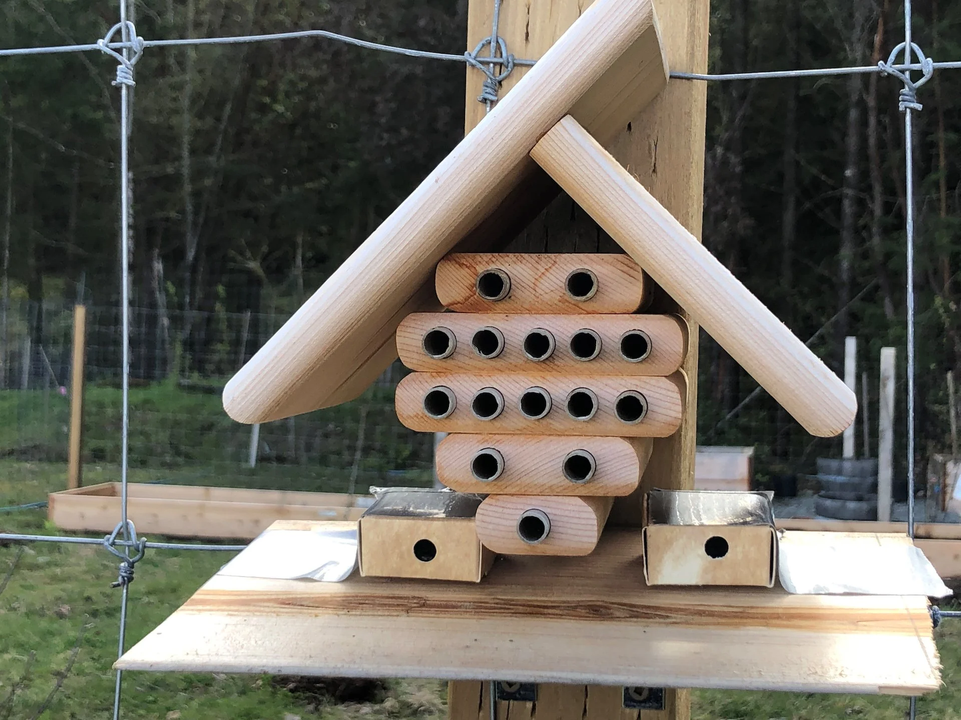 Last year, a friend of ours bought us a bee house. We had put it up but it never really attracted any bees over the course of last summer. As instructed, we brought it back in over the winter. This year, we decide to give the house a helping hand and bought a couple of (tiny) boxes of mason bee cocoons to help kick start the process. We figure with all the fruit trees, having more bees around would be a good thing! Hopefully this will work out.