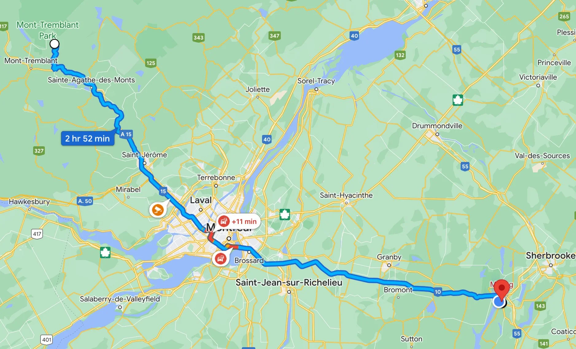 After than, we looped back towards Hudson to take the ferry to Oka and to continue our journey north. One very cool thing we noticed as we drive these back roads were all the commercial maple syrup harvesters. We first noticed all this blue tubing running through the forests, and eventually clued in to the fact of this is how you harvest sap at scale. It’s pretty amazing to see.