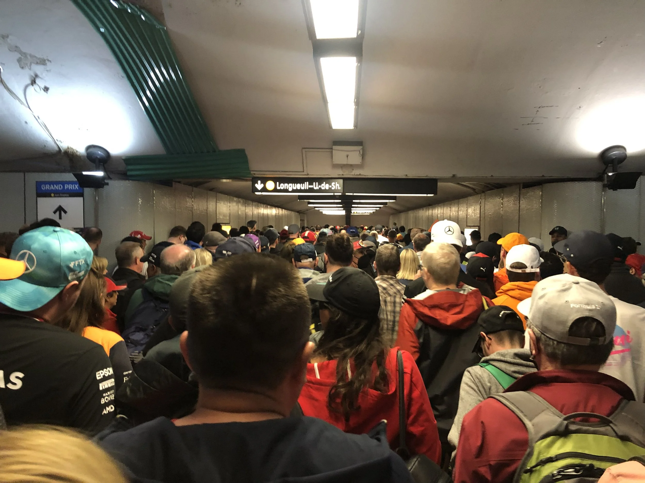 The subway to the venue was pretty good, but when we arrived, we were unprepared for the crowds. Right out of the subway entrance, we were into a line of thousands of people, snaking around the grounds and eventually filtering though a security check point, then across a bridge to shuttle buses that drove you to the pit lane.