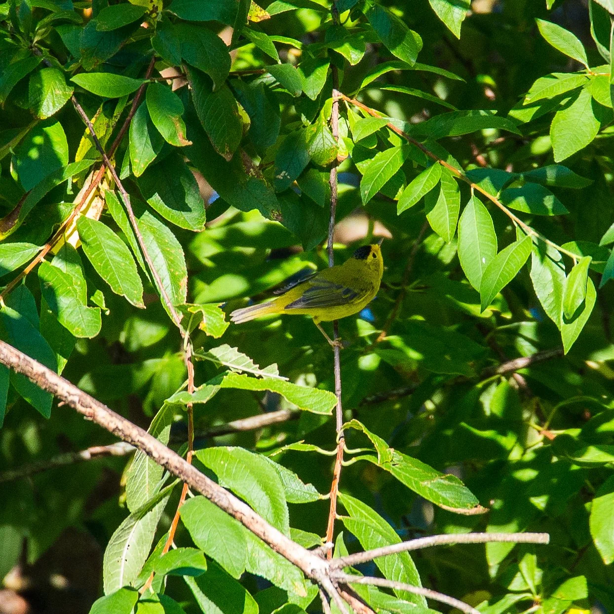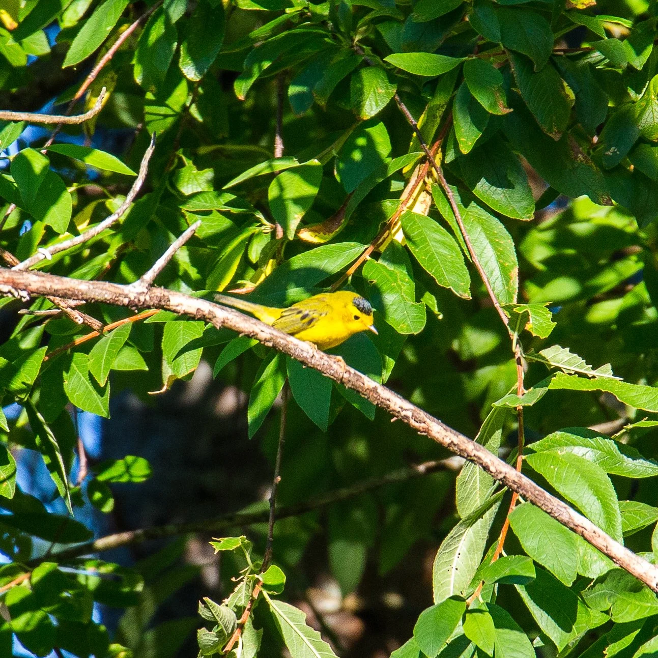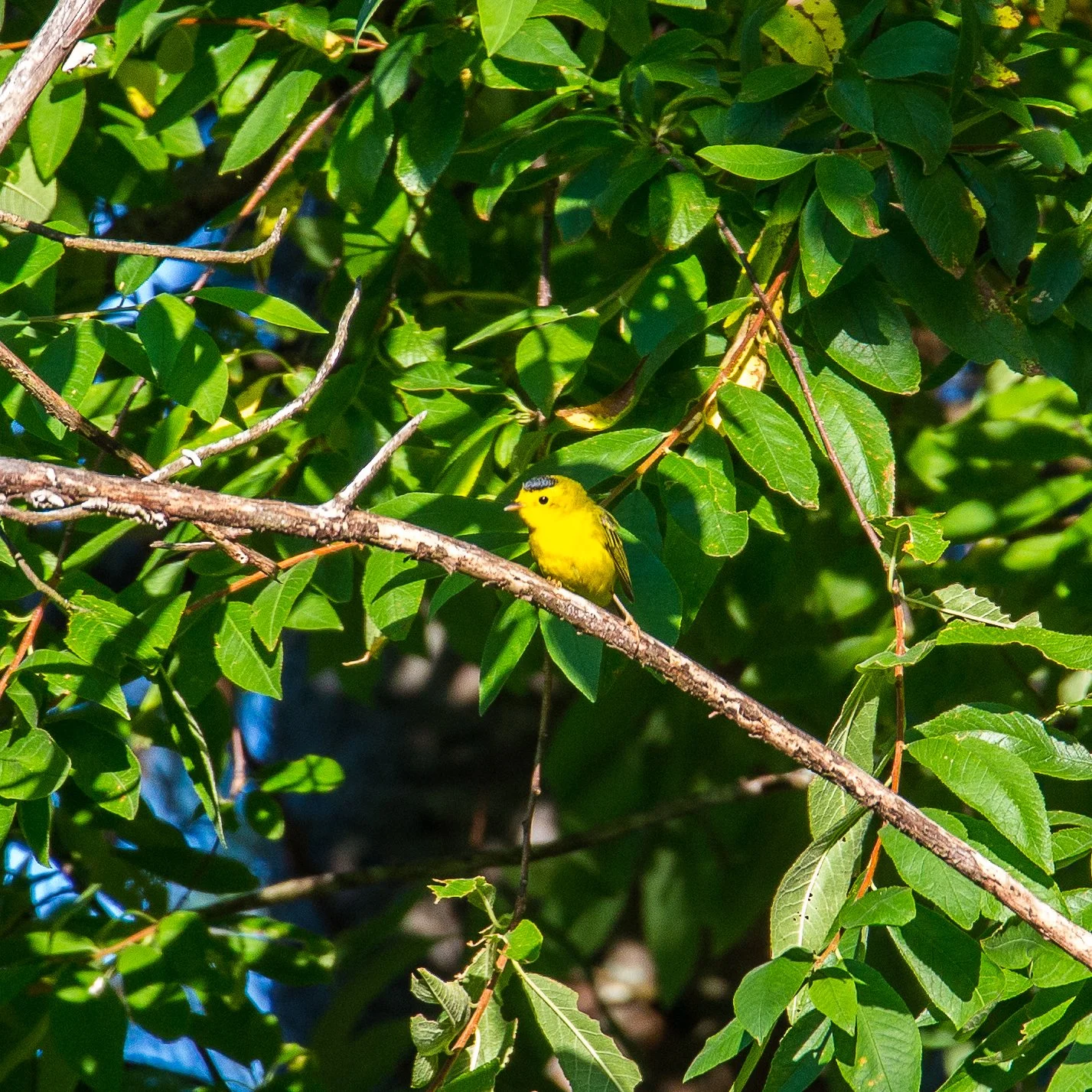 One of the more interesting things that has gone on this summer is that we have had a whole family of Wilson’s warblers living in the cherry tree at the edge of the forest. They seem to spend most of the day flitting about in the dense foliage. They disappear somewhere else at night. It’s been hard to get an exact count, but there must be 10-12 of them. There are juveniles (the less colourful ones) and the full yellow adults.