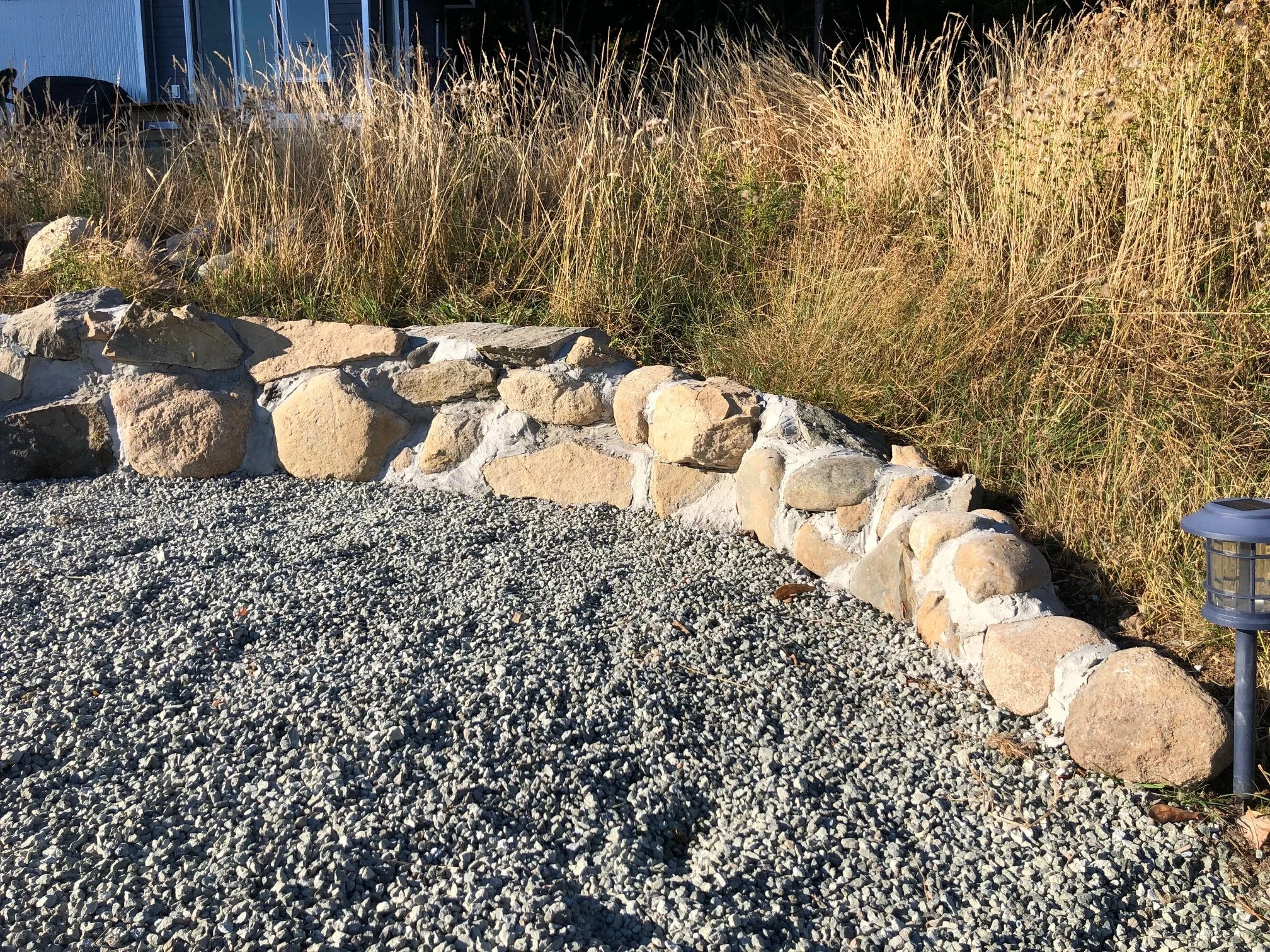 Then we had to pull it all down and start over with mortar. Again, this was much harder than it seemed like it should have been. We had all the rocks and knew where they should go, but as we pulled things apart, we had to subtly rework it. That and we needed a lot more rocks to fill in spaces between and behind the wall to give it enough structure and stability.