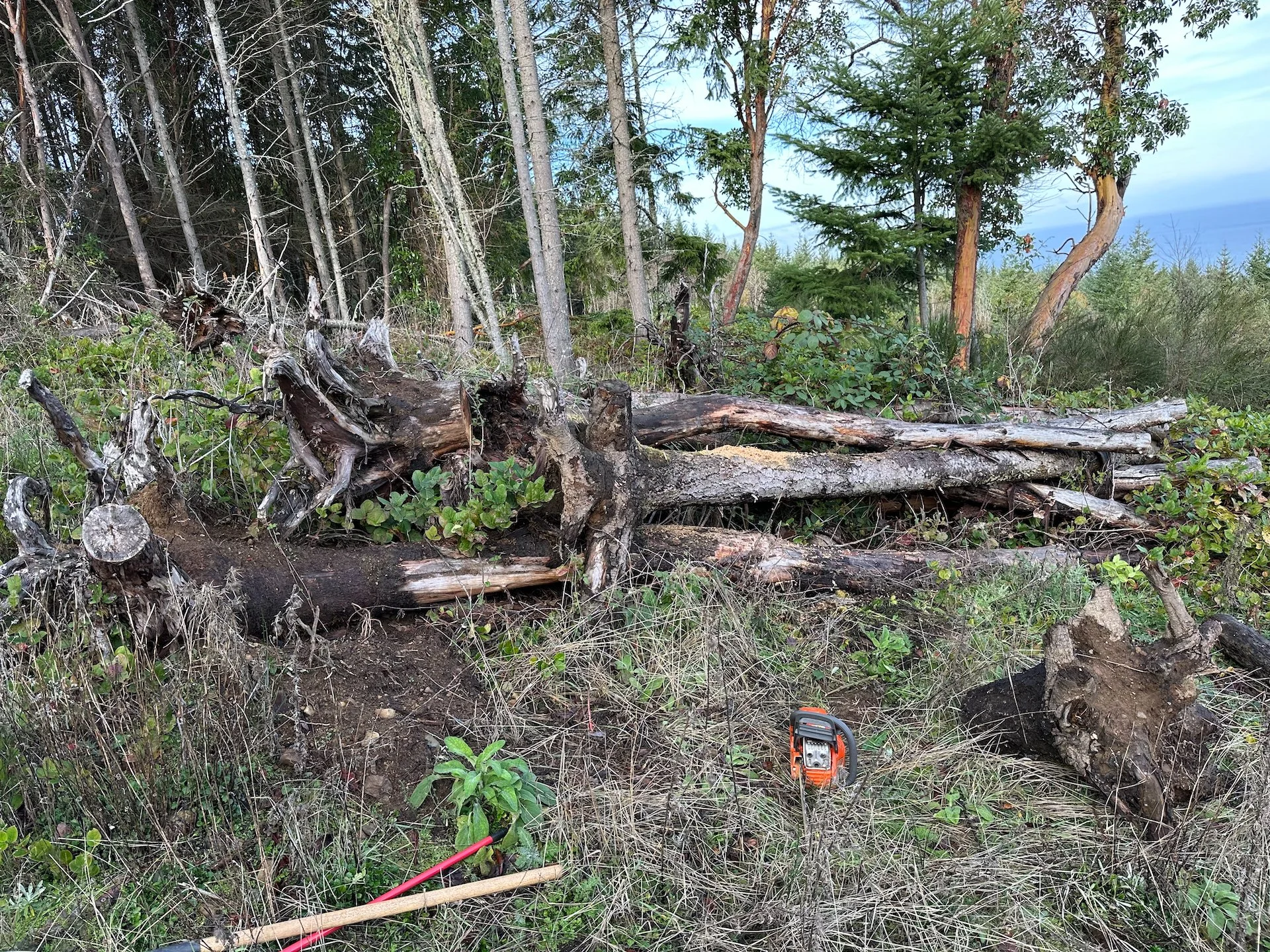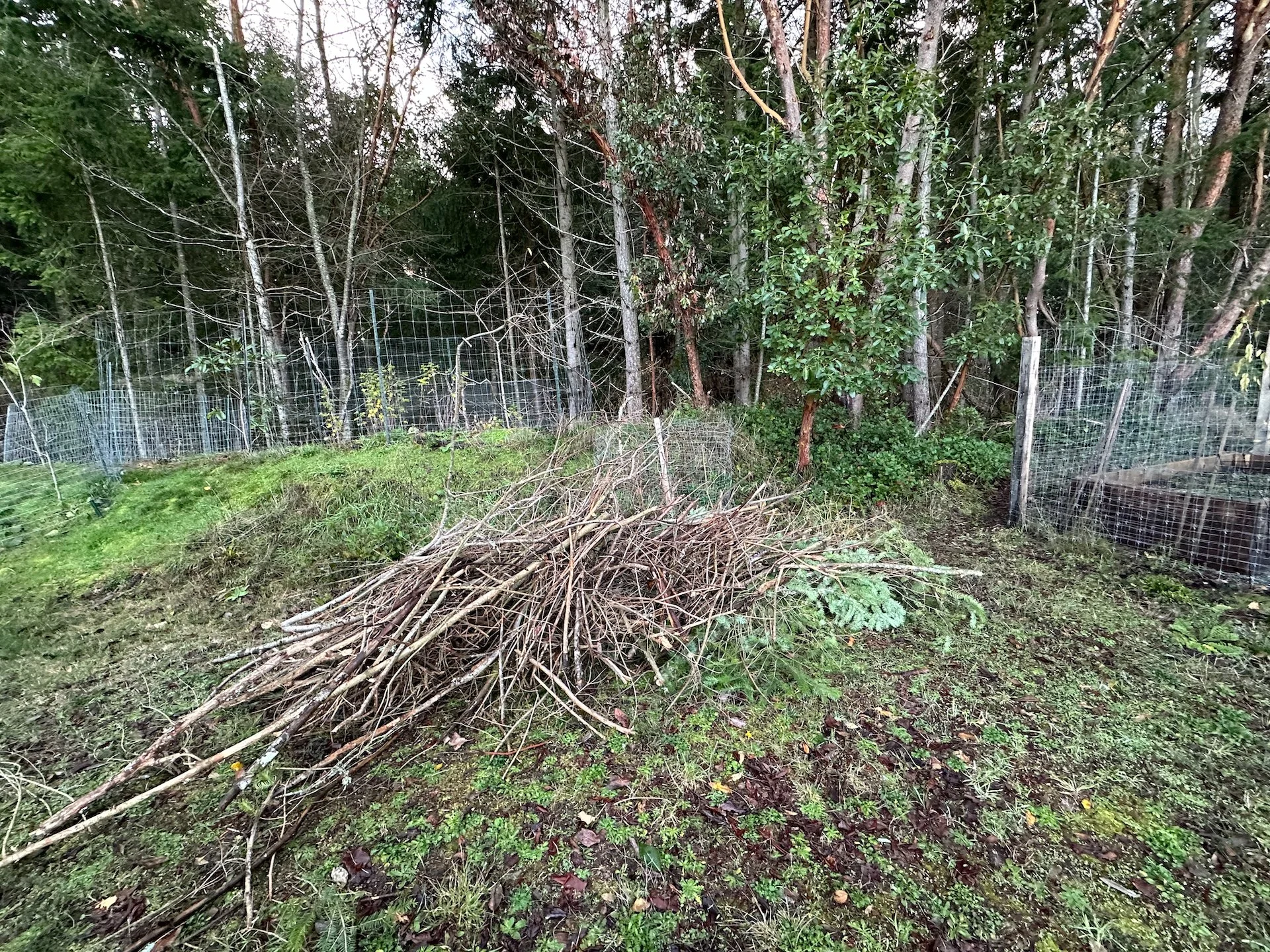 With that off the table, it was time to move on to cutting broome. As we move down the hill, the plants get bigger and harder to deal with. I spent a could of days working on the “west” side of the property, getting into the dense salal plants to cut out as much as possible. It was hard work, cutting them down then dragging the pieces up the hill to where I was making a burn pile.