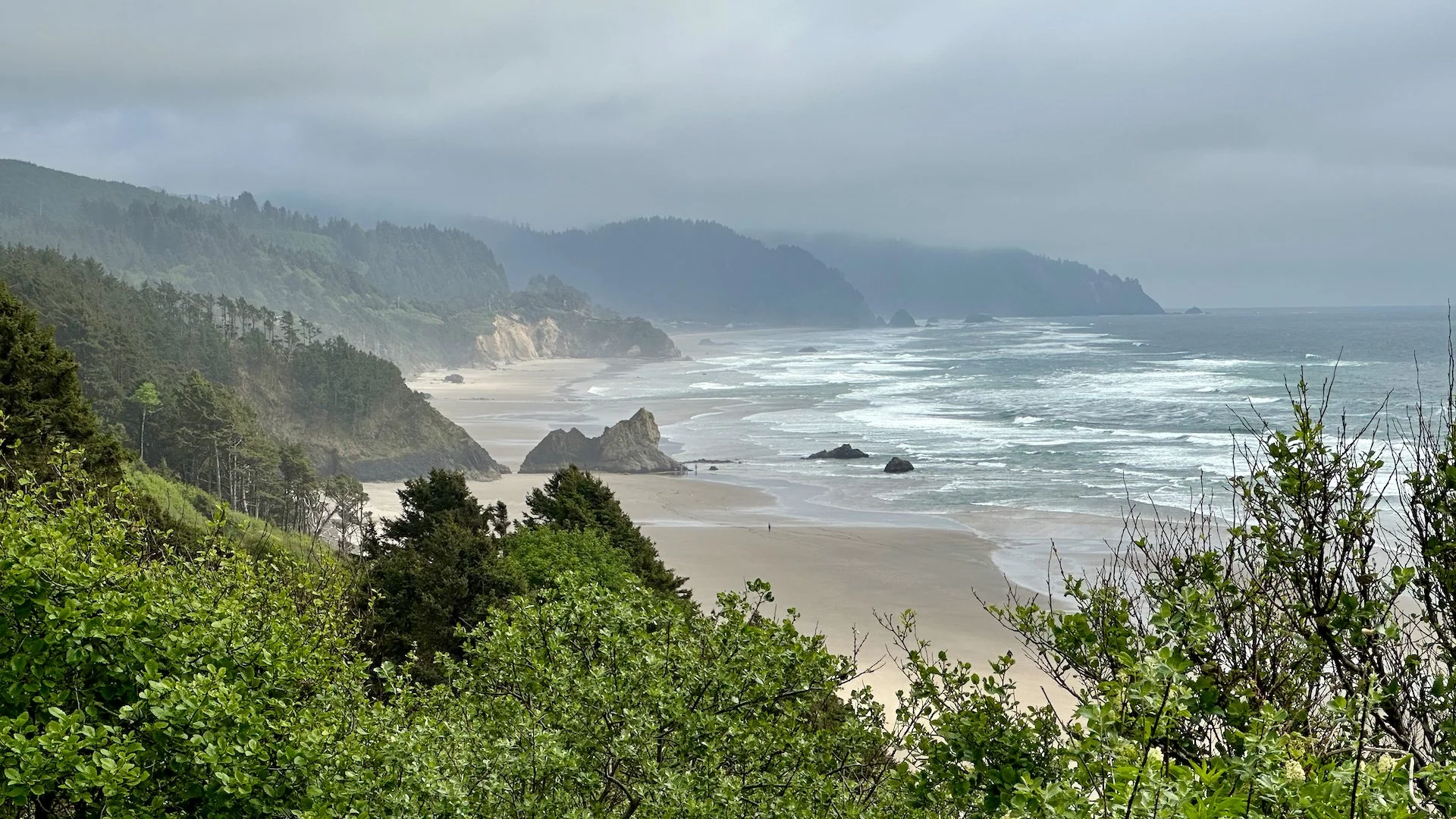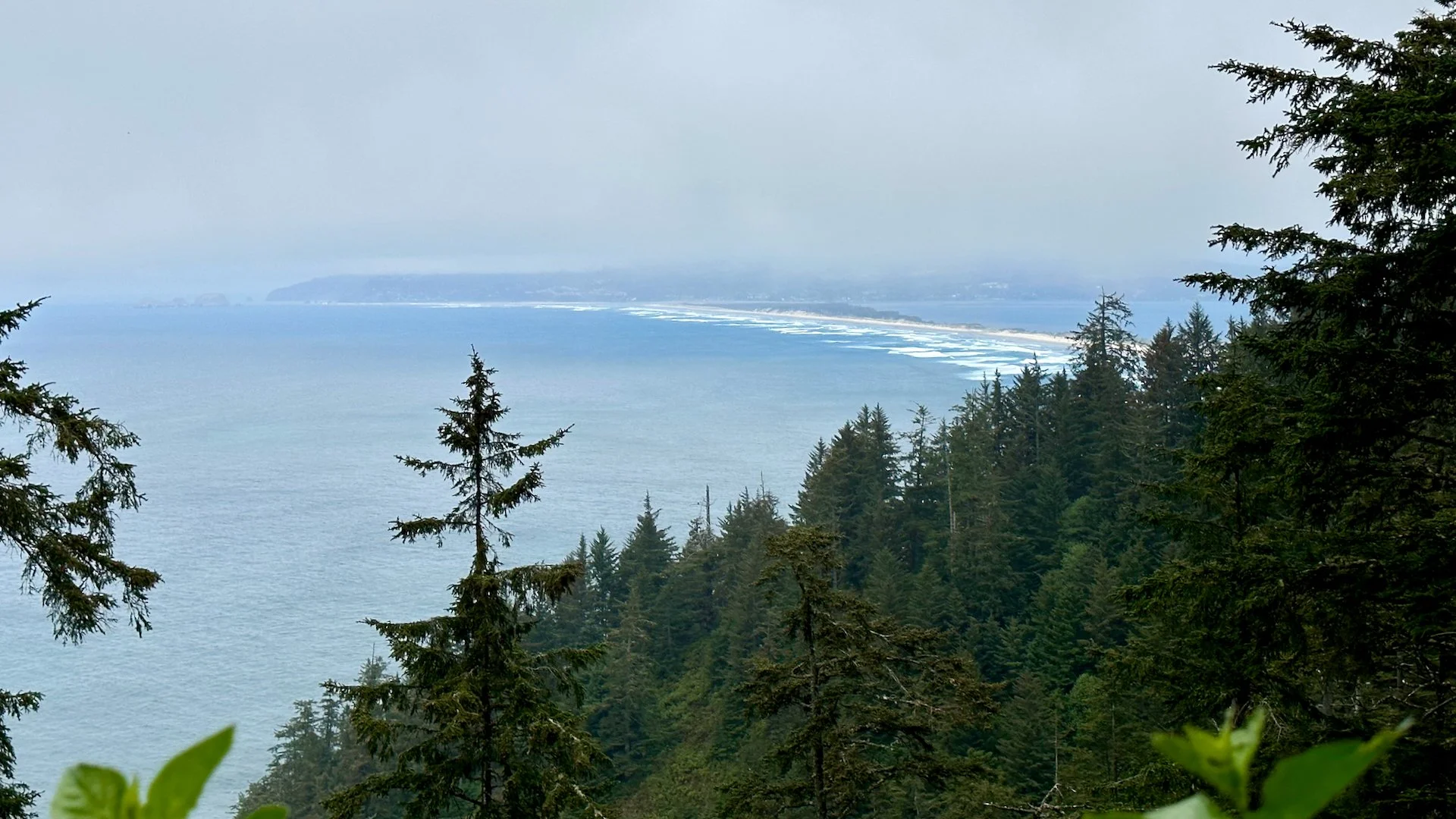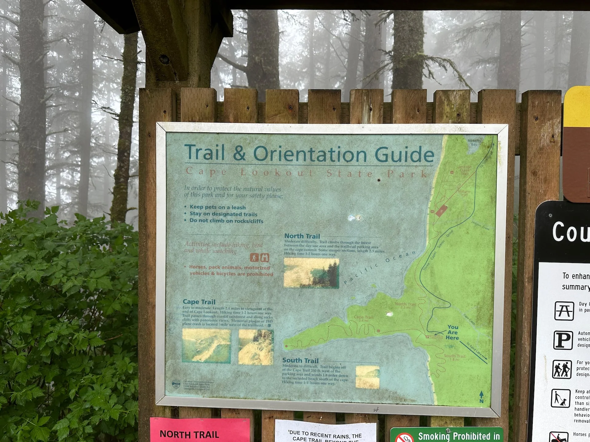 The hike we chose was at Cape Lookout Sate Park. This narrow, cliff-edged cape juts 2 miles straight out into the Pacific Ocean. At the trailhead atop the cape, we had three choices: walk out to the viewpoint at the cape's tip; descend to a secluded beach at the southern base of the cape; or head north along the bluffs to the state park's popular picnic area and campground.