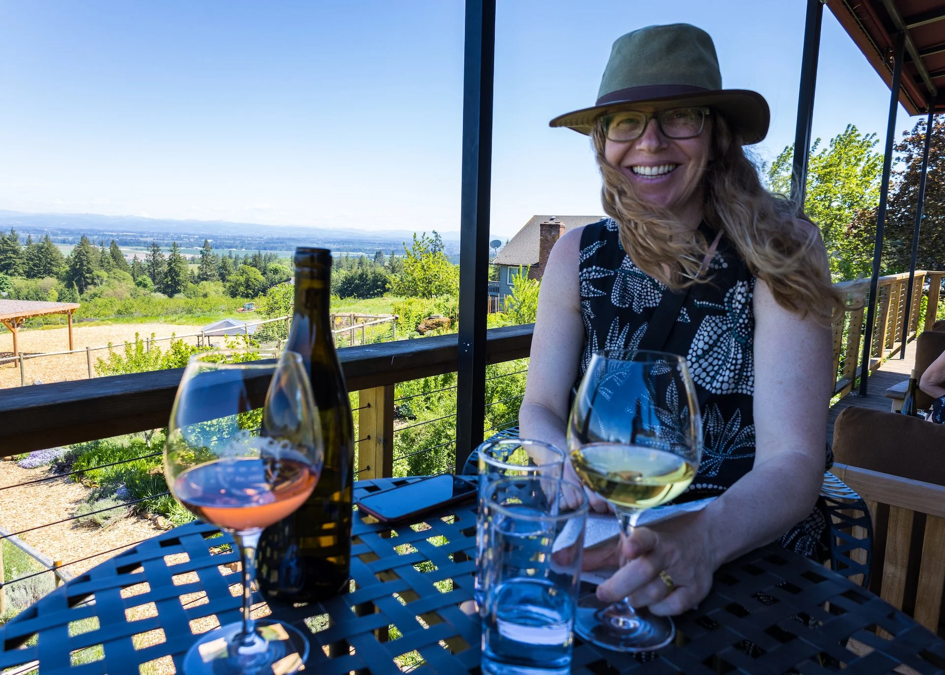 The winery was about 30 minutes further into the valley, and it was about 1:00 by the time we arrived. The winery sits up on a hill, with sweeping views back inland. As the day was fairly clear we had views of four mountains - Mount St. Helen’s, Mount Adams (faintly), Mount Hood and Mount Jefferson. It’s been a good trip for seeing mountains.