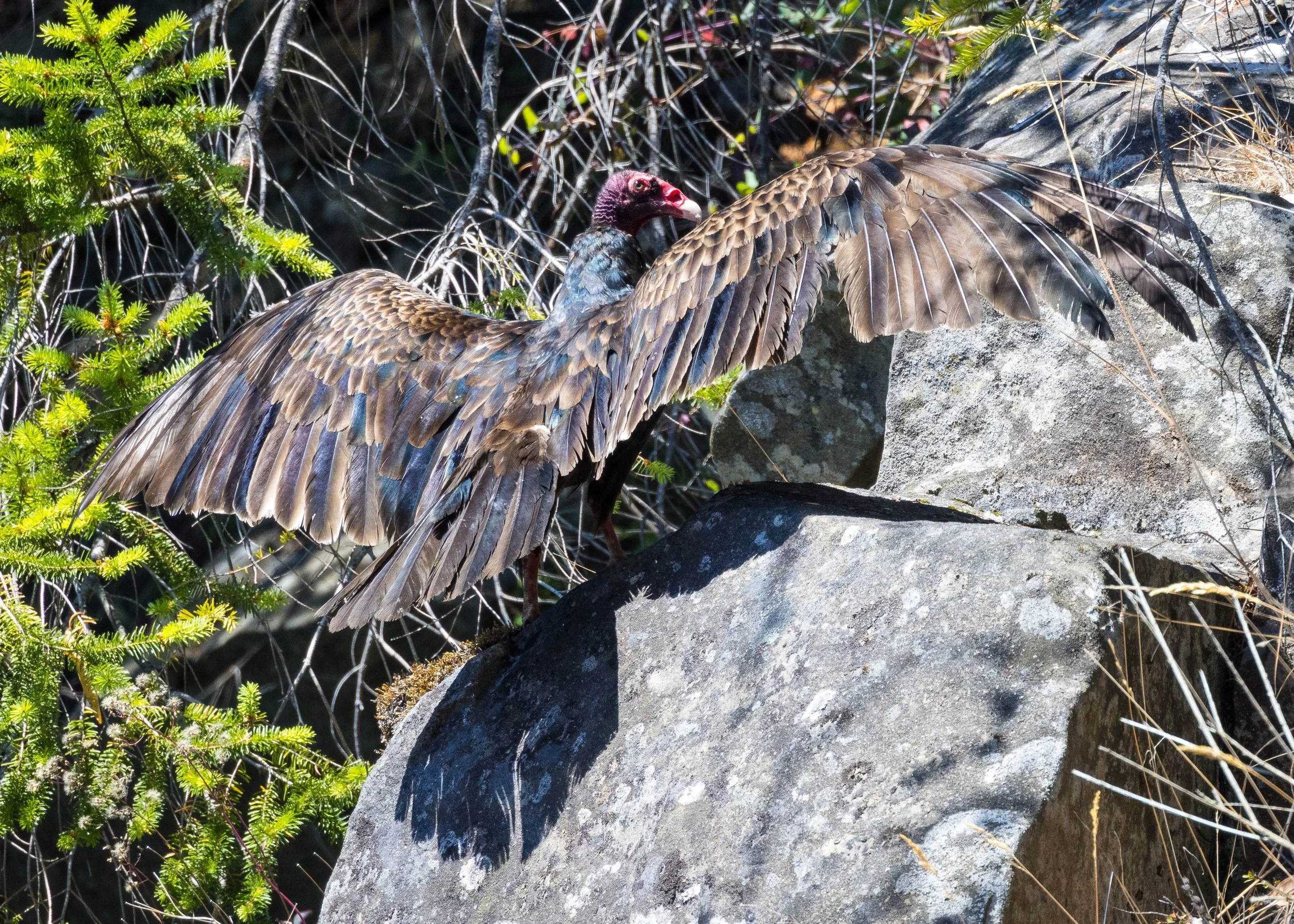 I didn’t see it initially, but there was a turkey vulture sitting on the small, exposed bit of beach when we arrived. It flew up to one of the trees overhanging the beach and stayed there for quite a while. I got quite a few photos before it flapped off, resting a little further away on the rocks and spent the rest of the time we were there sunning itself. You don’t often see them that close up. They are pretty big and very interesting.