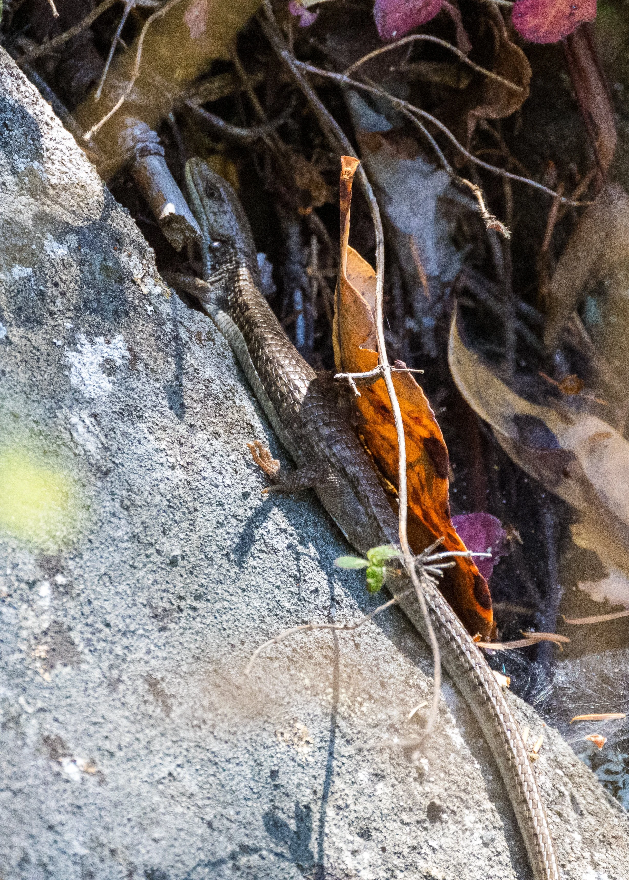 Justine’s sharp eyes picked out this little guy sunning itself on a rock as we hiked along. I believe it’s a Northern Alligator Lizard.
