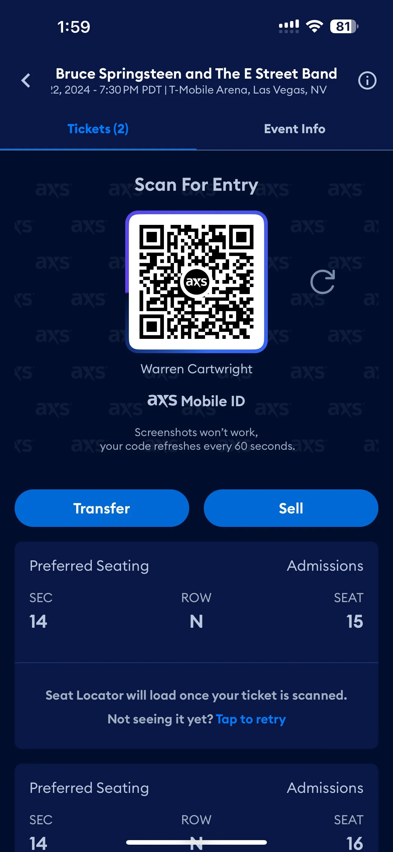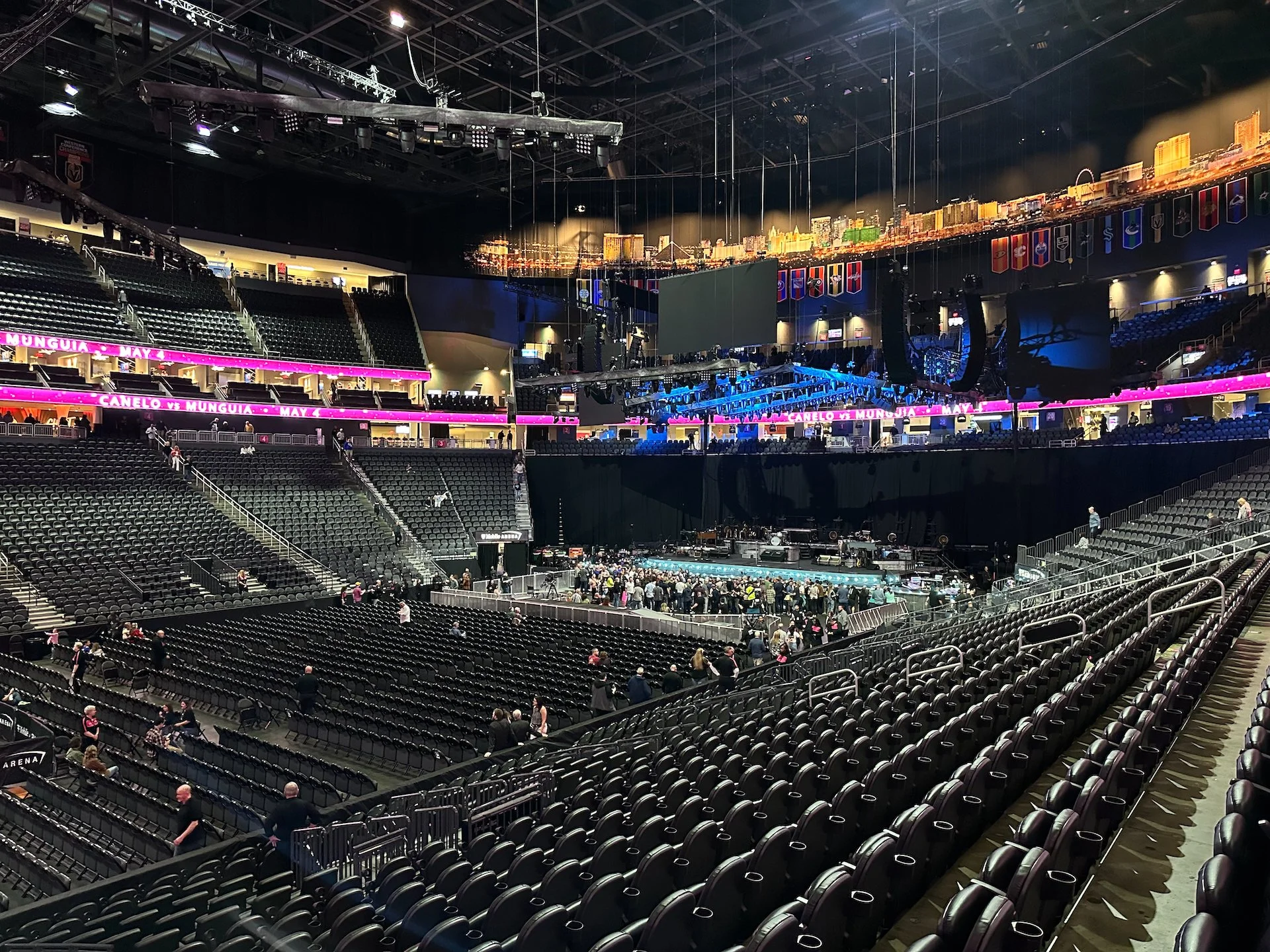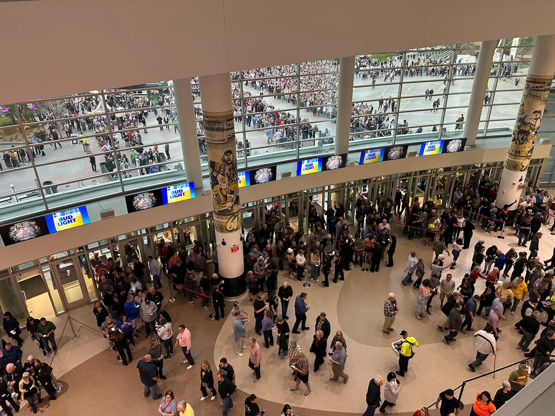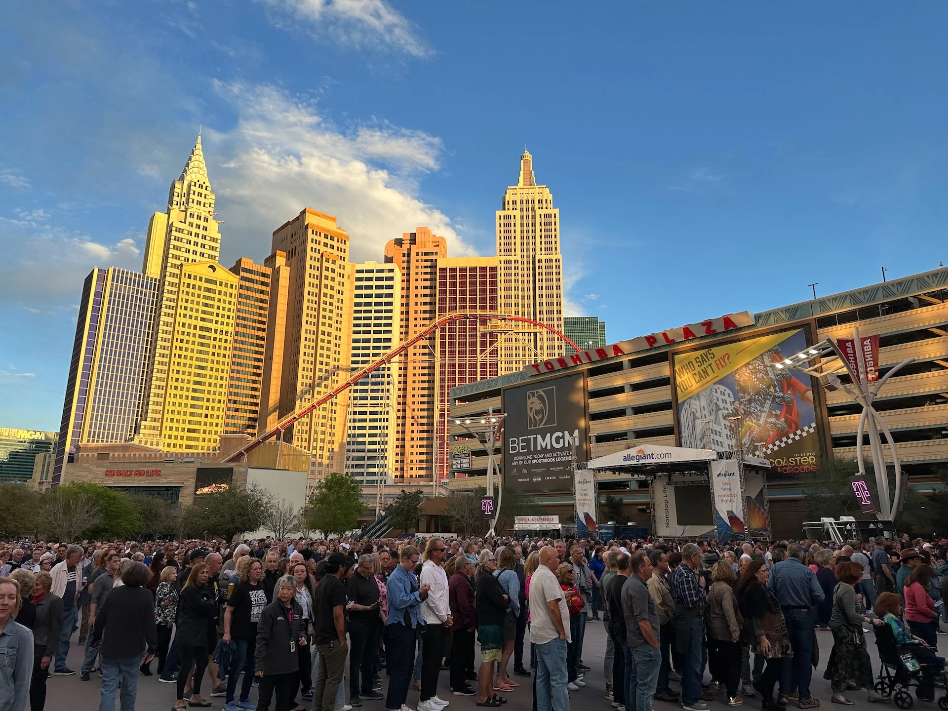 We went back to the hotel, got changed and then basically headed back to where had just been, Brew Haus sits on the edge of the plaze out front of T-Mobile Arena, where the concert was happening. Doors opened at 6:30 and the band was supposed to start at “7:30 sharp”. We headed over around 6:00 to see how things were looking. Crowds were definitely starting to form, and I was somewhat surprised to see that the crowd was trending even older than me! Justine and I were bringing the average age down.