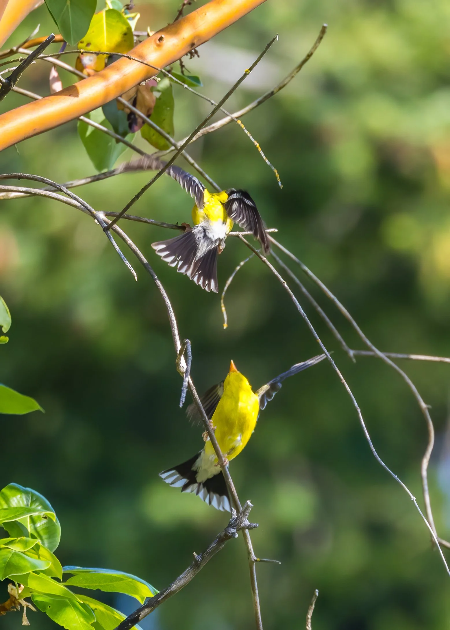 I was petty pleased with this one - two goldfinches chasing each other through the arbutus.