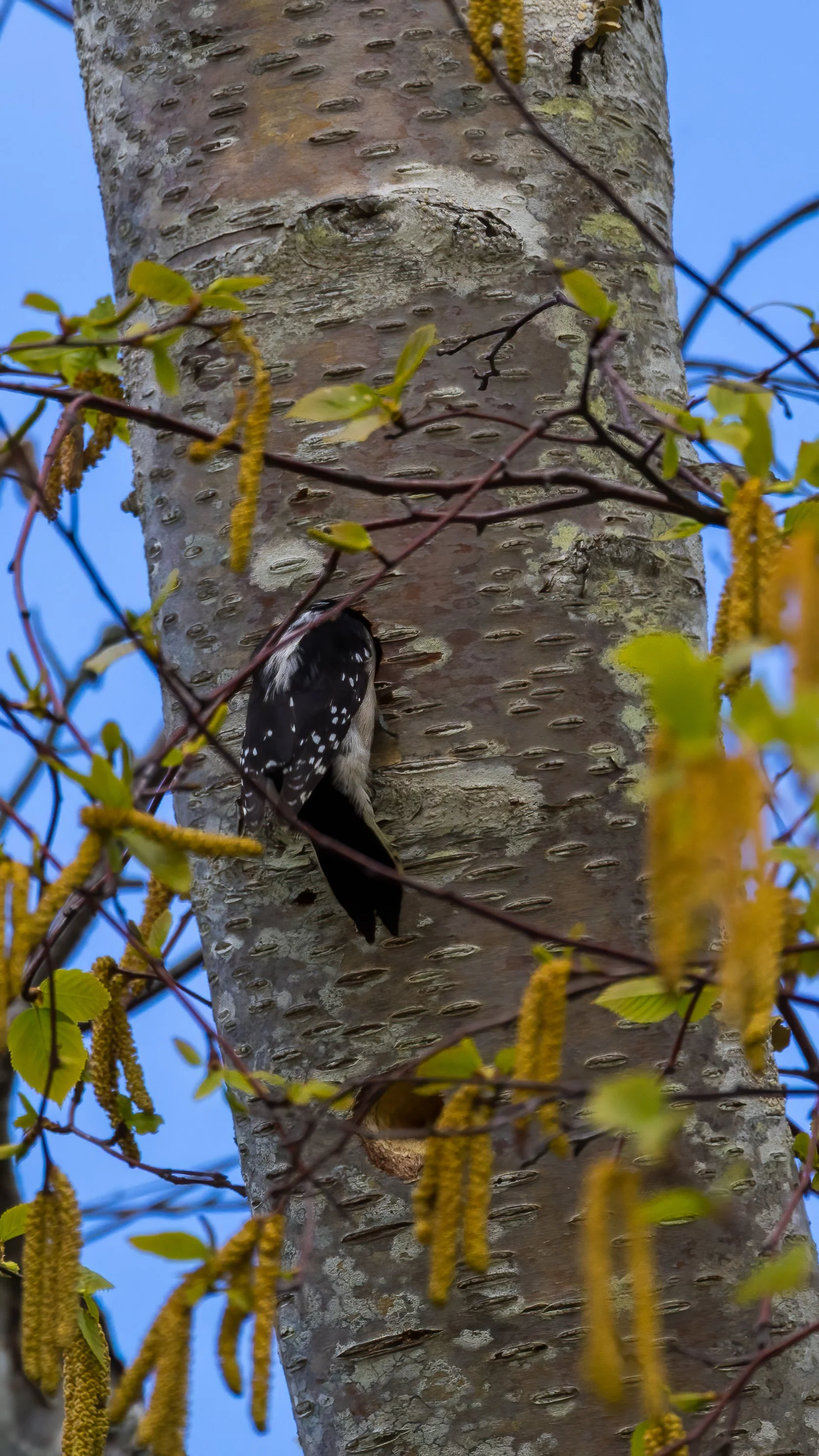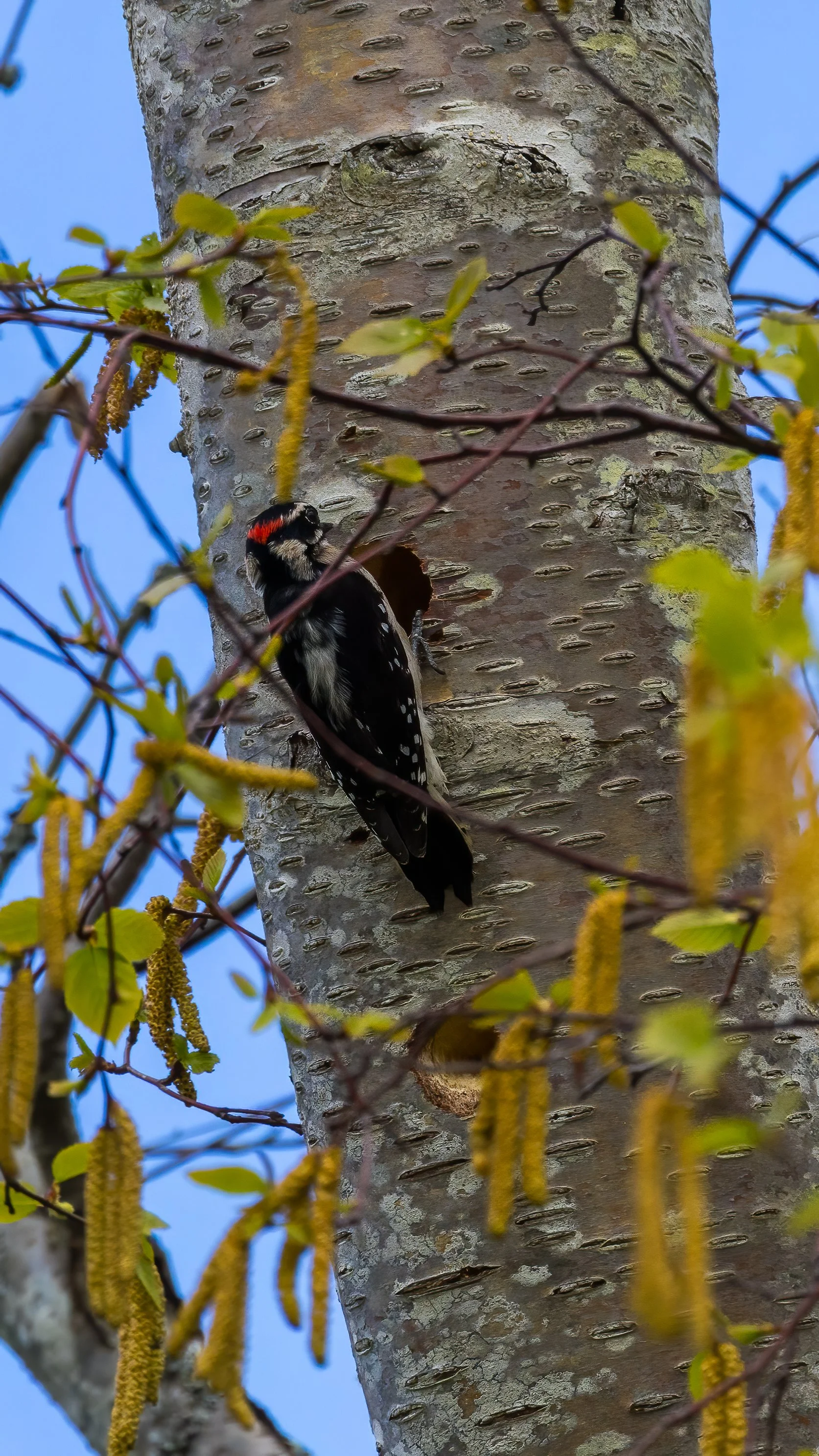 We walked from the parking lot, down the road, onto one of the side roads and down to a beach access point. Along the way we found a downy woodpecker building a nest. He seemed to be working on two separate holes.