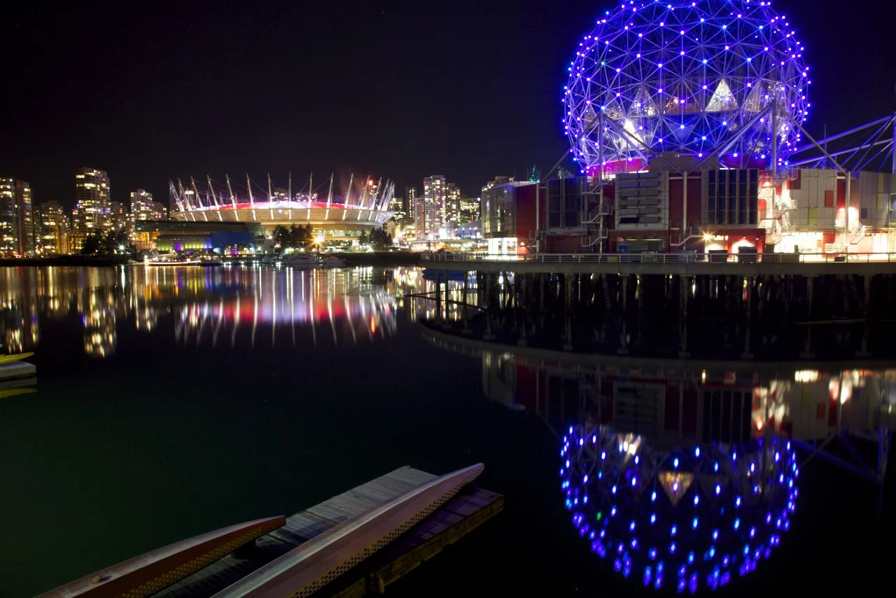 Science World and BC Place reflected in False Creek.