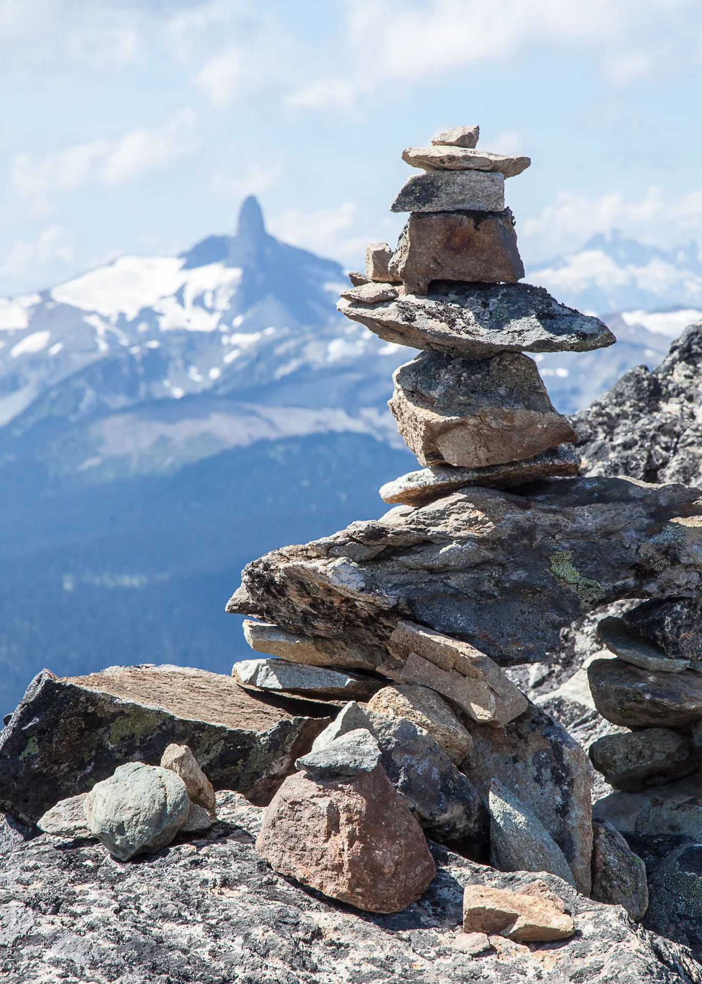 An inukshuk at the top before we started the trail, with Black Tuck in the background.