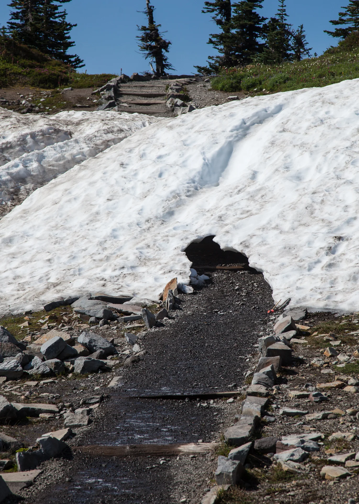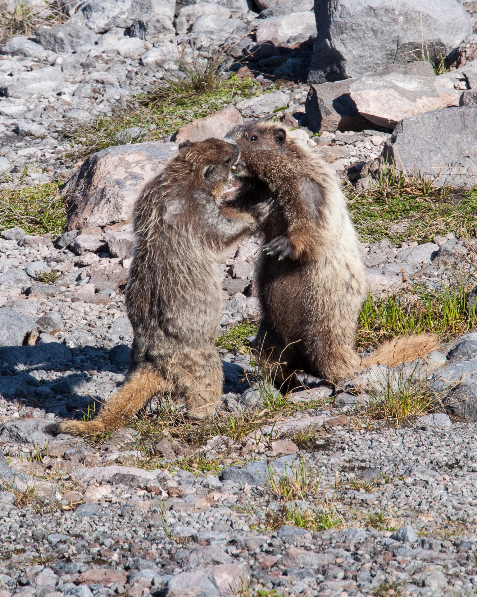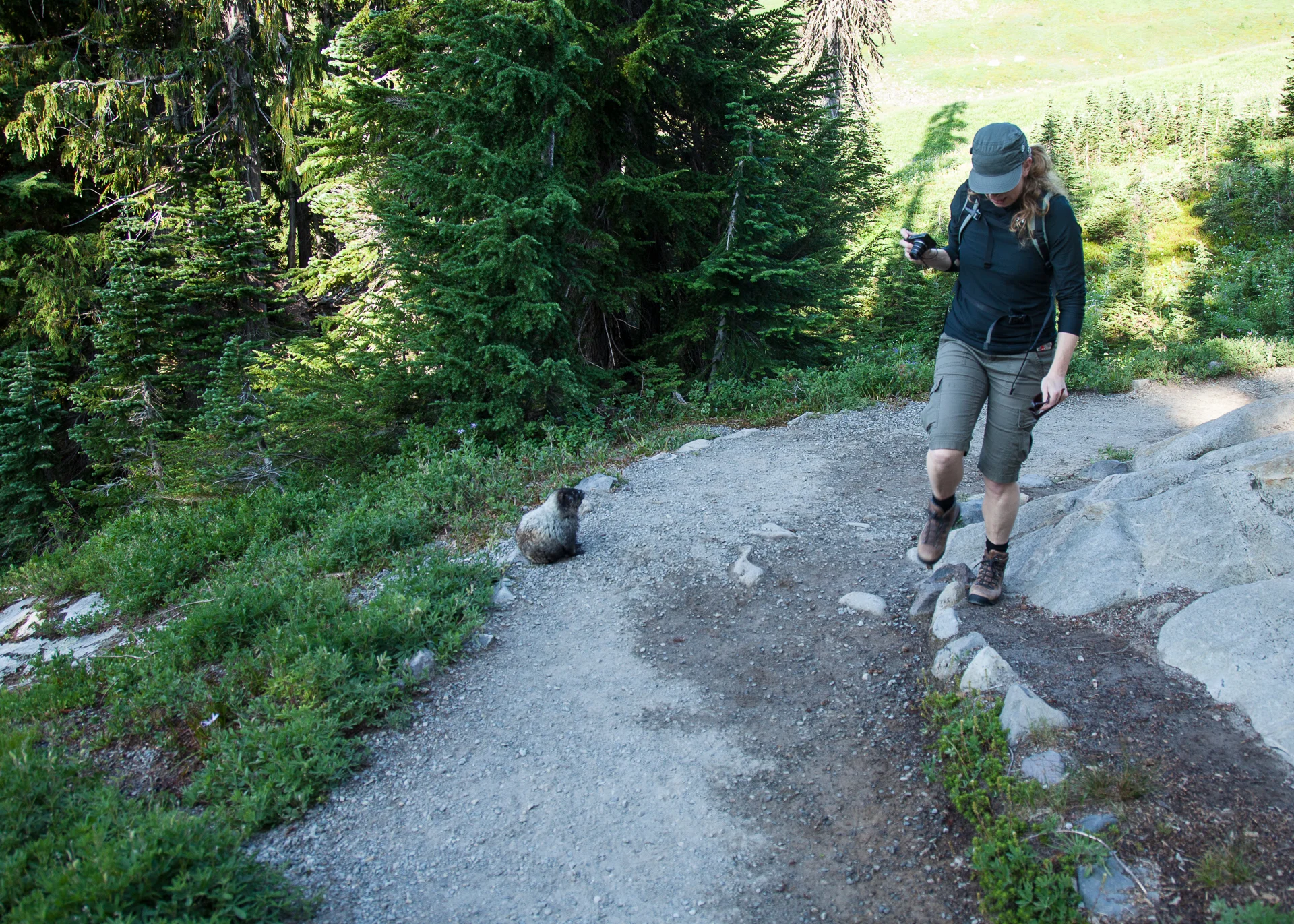Almost immediately, the trail began to climb. We crossed a couple of small rivers and waterfalls, and had a close encounter with a marmot and more deer. The colours of the wild flowers were amazing. The trail climbed steadily for a while, offering up views of the local mountain ranges. Everywhere you looked was a riot of colour. Eventually we reached a connection with another trail, the Paradise Glacier Trail. This was a 3/4 of a mile out-and-back that lead up to the edge of one of the 28 glaciers on the mountain. The trail was nice, and got us up onto the snow. We also got to see a whole family of marmots, including some young ones that were boxing. It was fun.