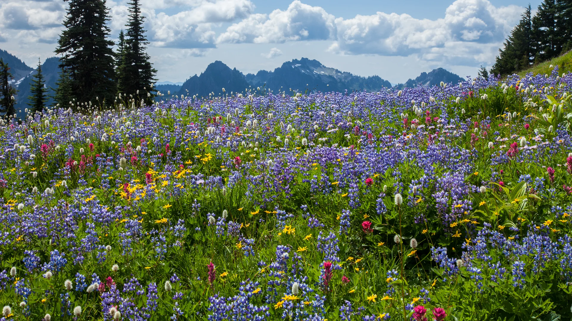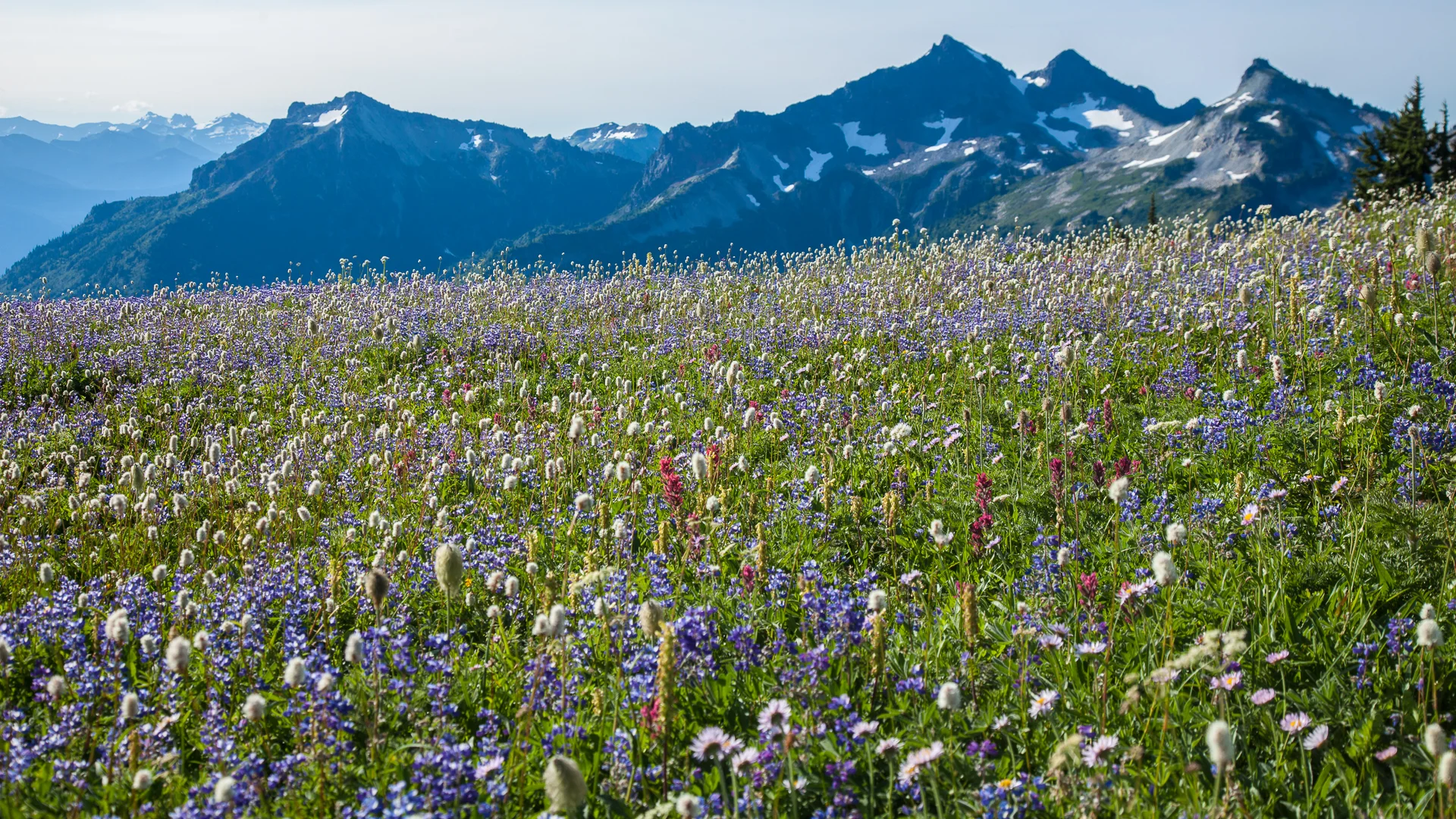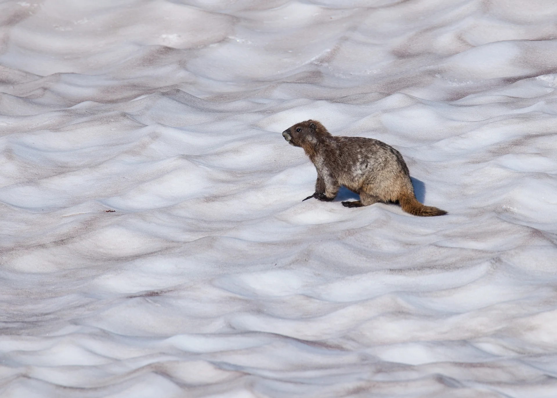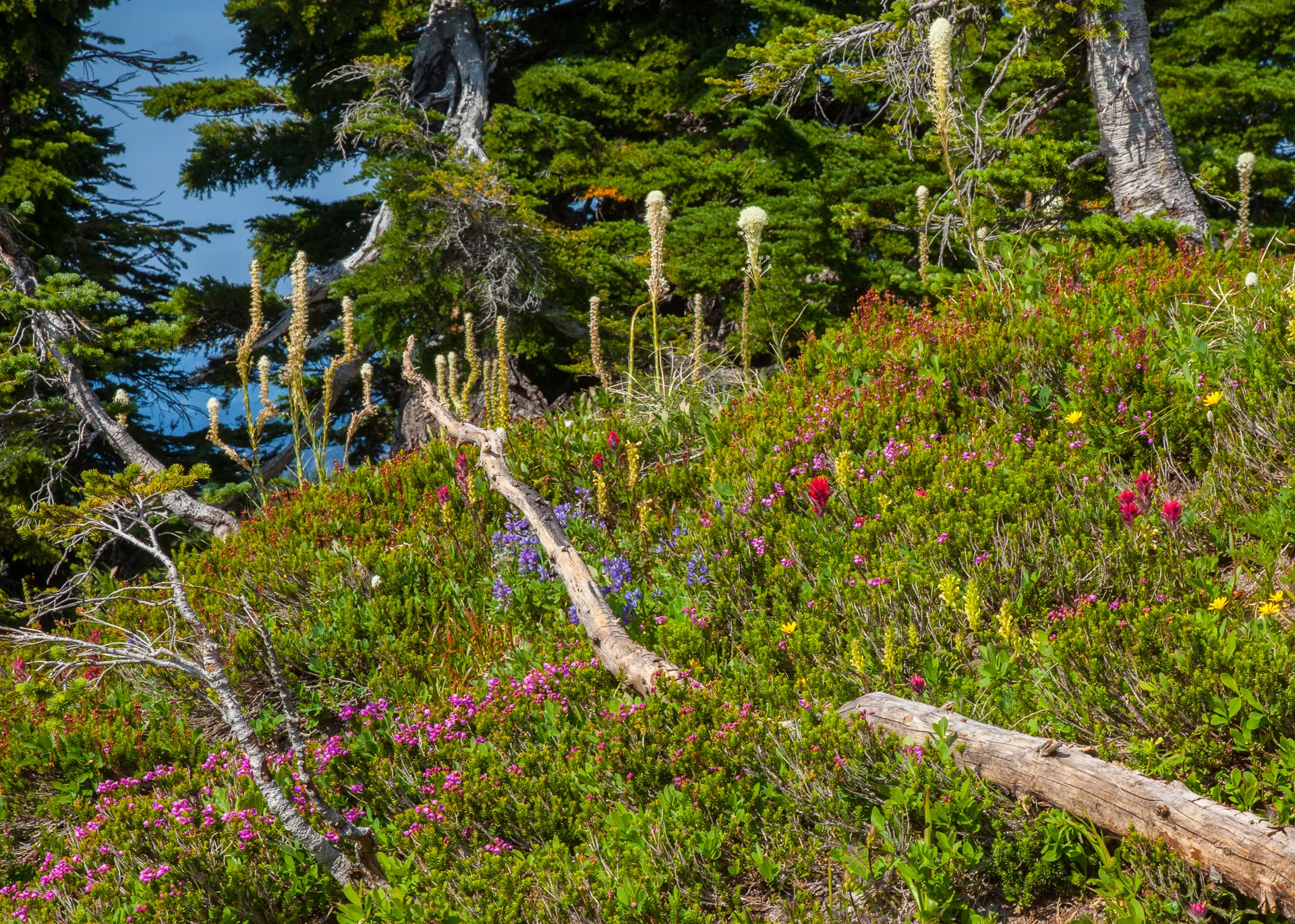 Almost immediately, the trail began to climb. We crossed a couple of small rivers and waterfalls, and had a close encounter with a marmot and more deer. The colours of the wild flowers were amazing. The trail climbed steadily for a while, offering up views of the local mountain ranges. Everywhere you looked was a riot of colour. Eventually we reached a connection with another trail, the Paradise Glacier Trail. This was a 3/4 of a mile out-and-back that lead up to the edge of one of the 28 glaciers on the mountain. The trail was nice, and got us up onto the snow. We also got to see a whole family of marmots, including some young ones that were boxing. It was fun.