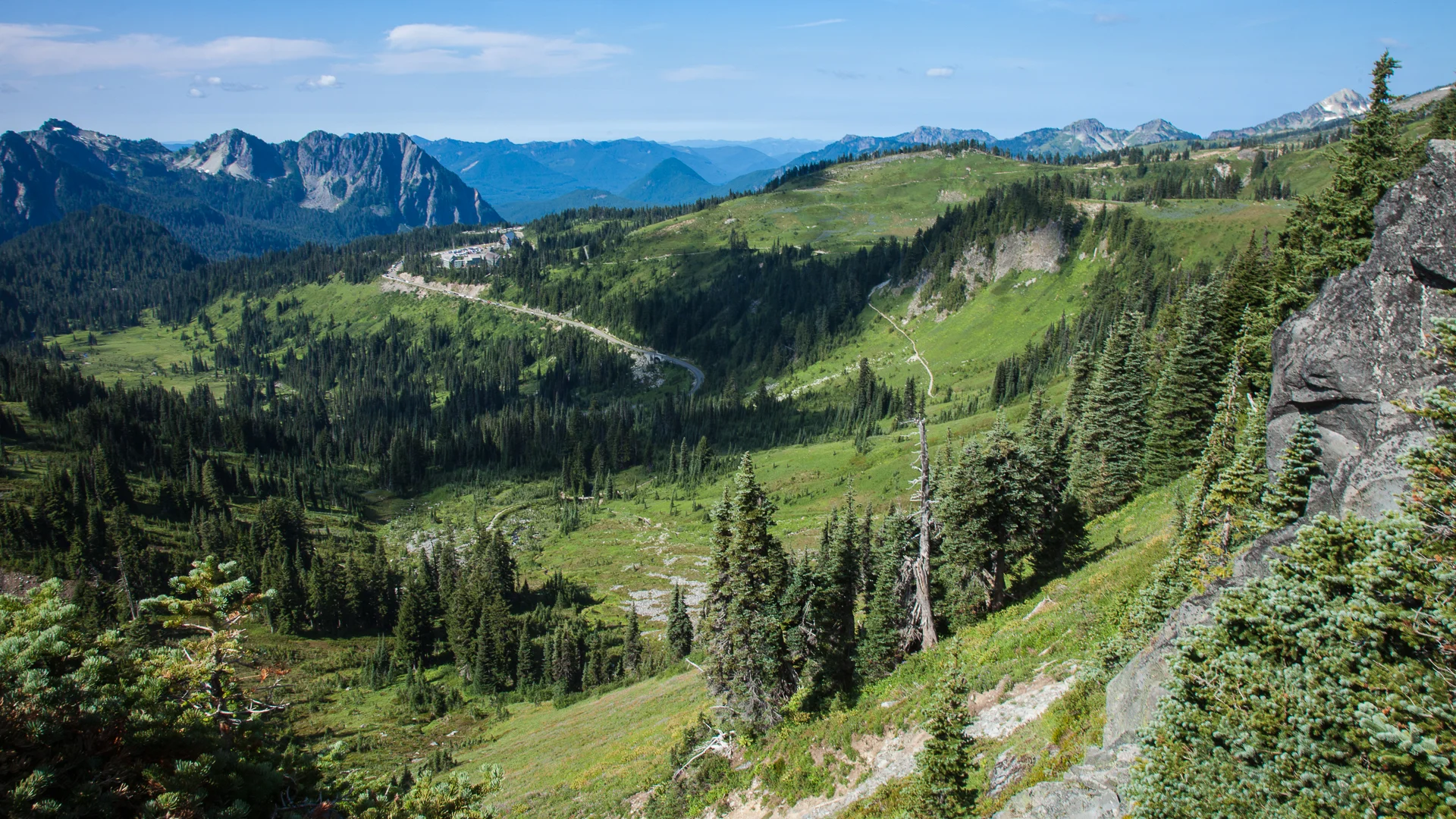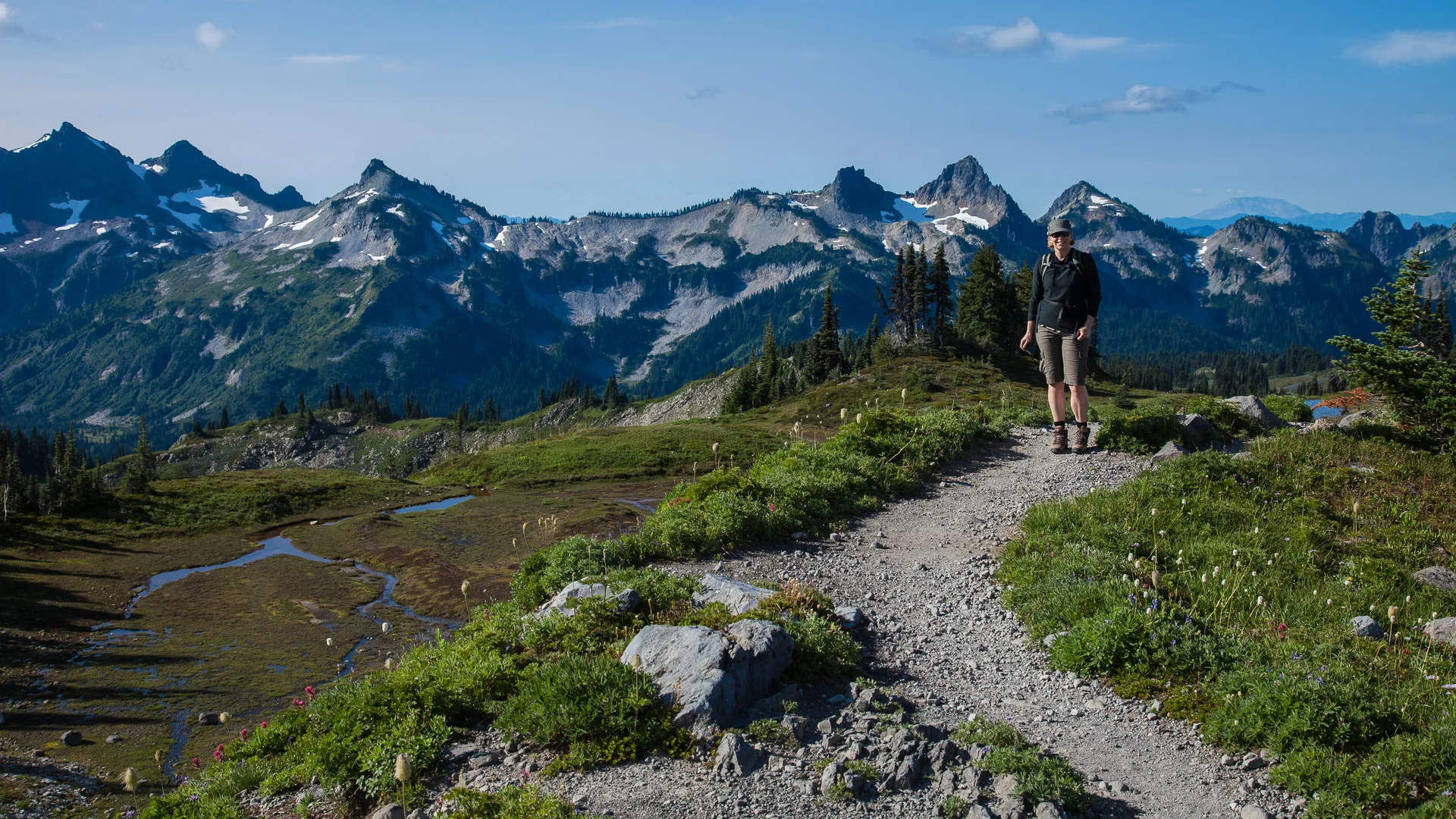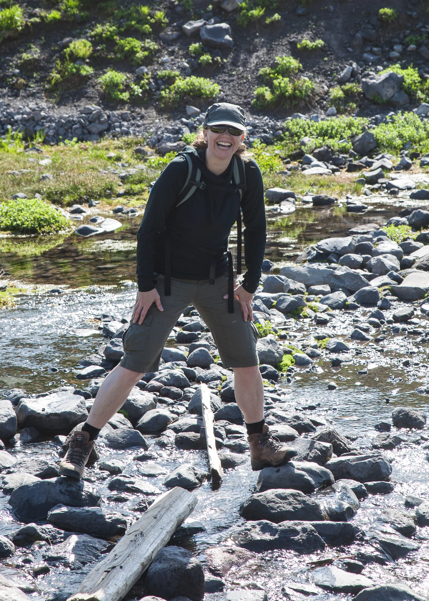 After walking on the snow (always fun in August) we headed back down to the main trail. It worked its way back across this beautiful little valley, then started to climb again. We had mistakenly thought that our climbing was done for the day, but we were very, very wrong. The trail started a second ascent that followed a series of switchbacks. While it was a bit tough, the added elevation brought a whole new view to us. We could see all the way south to Mount Adams and Mount St. Helens (Mount Hood was obscured in the clouds), and of course, the electric blue of the glaciers on Mount Rainier kept getting closer and closer.