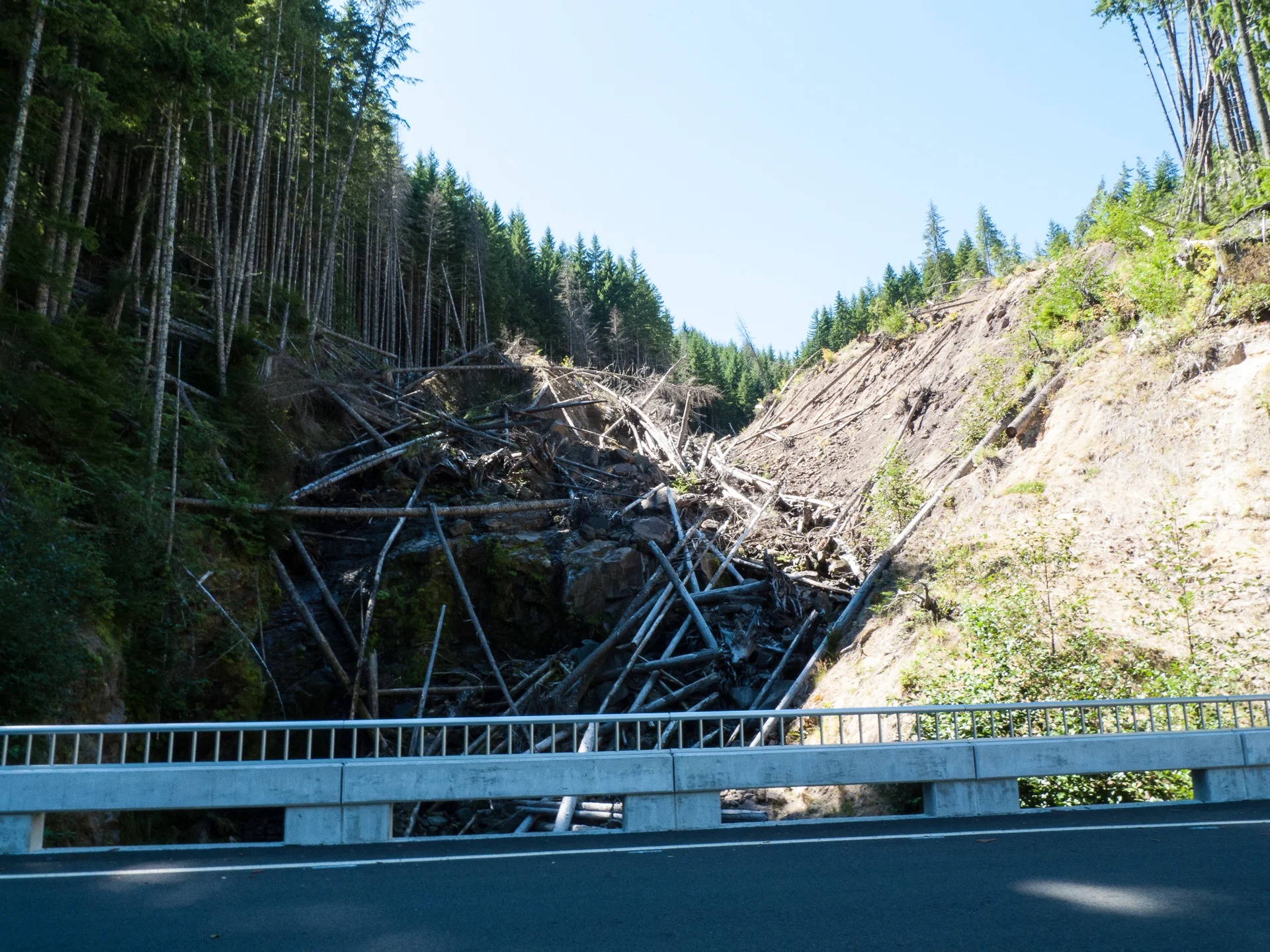 Our route took us south, then west then south again, after turning onto a paved forest service road. We got gas in one of the small towns along the way, which was good because there wasn't much in the way of civilization after that. The road took us mostly south, skirting the eastern side of Mount St. Helens. It was a twisty, turny road, which was lots of fun to drive along. At one point we passed what must have been a massive washout, where it looked like half the mountain must have come down.