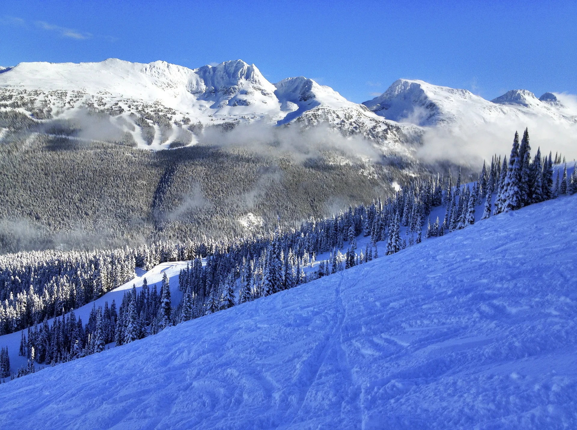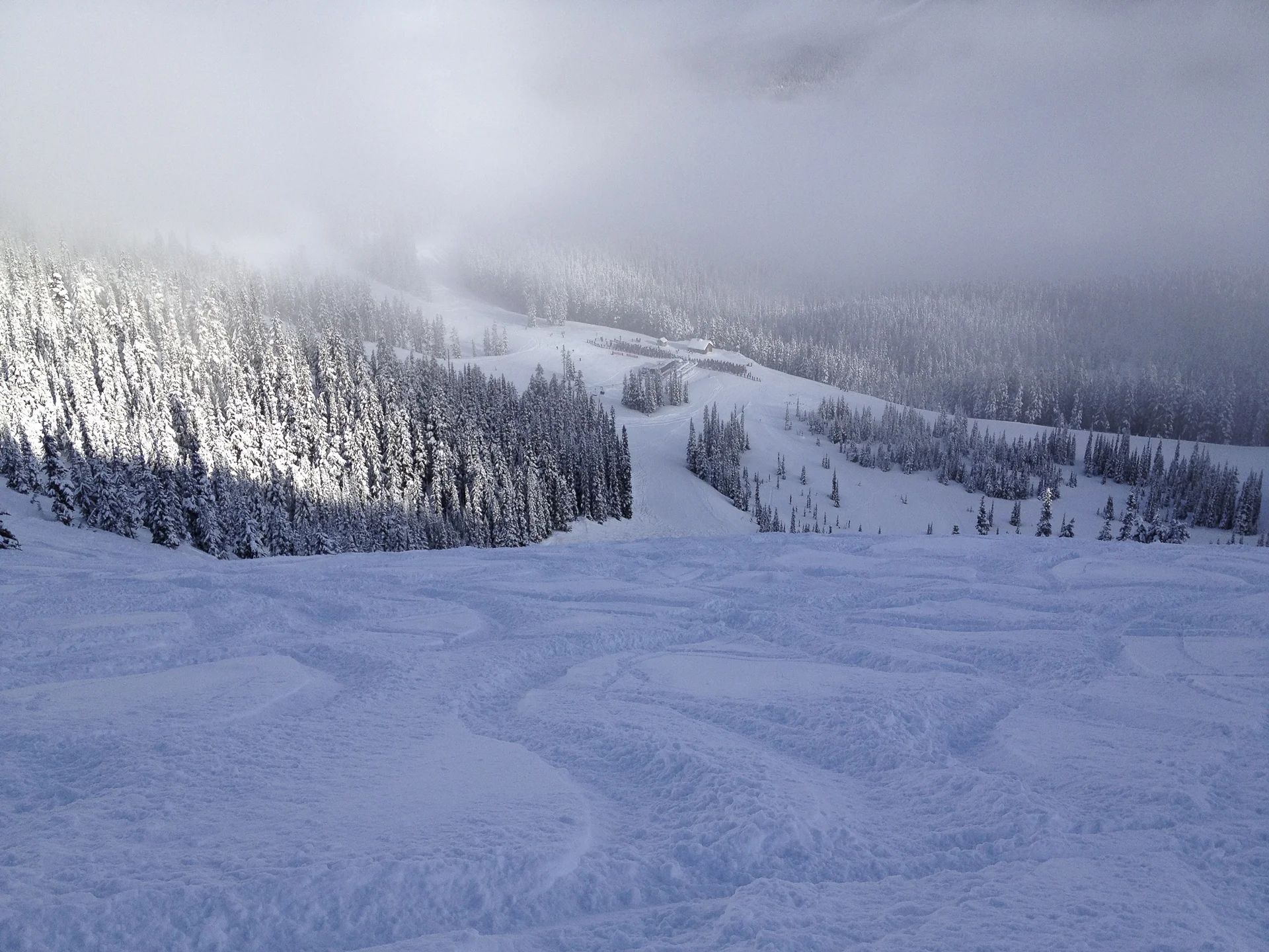 At the start of the day, the Whistler crew were busy dealing with avalanche conditions. None of the “interesting” areas were open, and you could hear them setting off the explosives, triggering the avalanches. It went on for a long time. The early conditions were amazing - on my first run, right at the top of the lift I ran into (well not literally) the groomers on the way up the run, so I was able to jump on the fresh corduroy trail they left behind them, and cruise that out to warm up. That lead me to a run that almost no one had been on that day, which meant fresh tracks for me! It was a perfect combination.