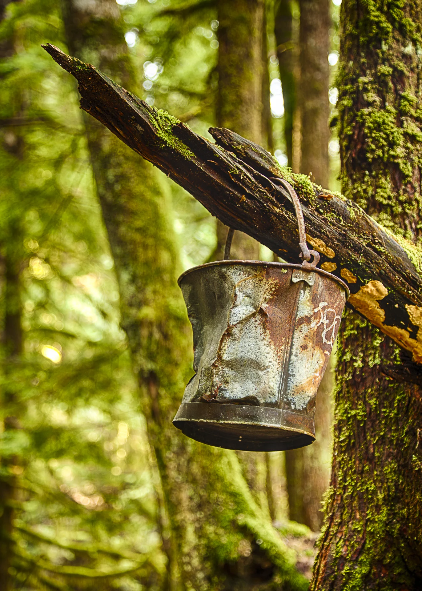 The whole of the North Shore was completely logged in the last century, and there are quite a few remnants of the logging camps scattered throughout the Lynn Canyon area. Part way through our hike, we can across an old metal pail, hung on a log, so I stopped t take a few pictures.